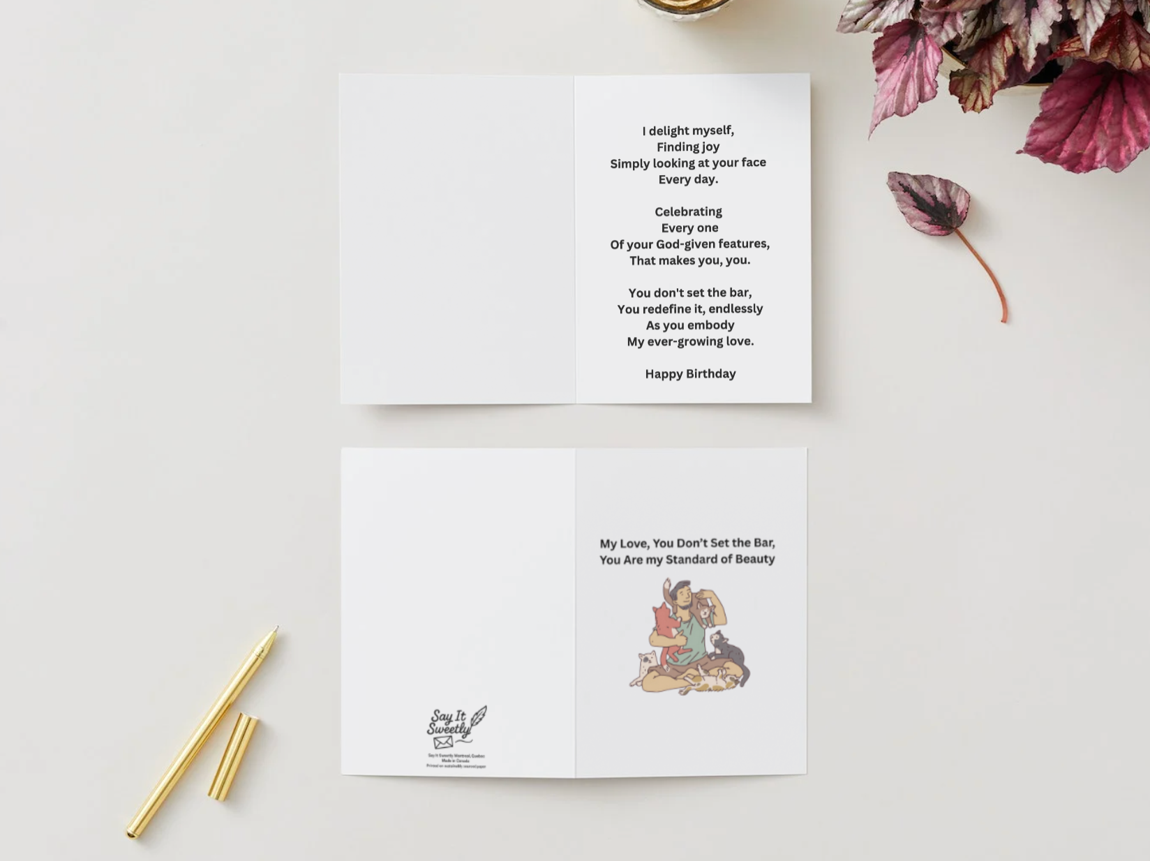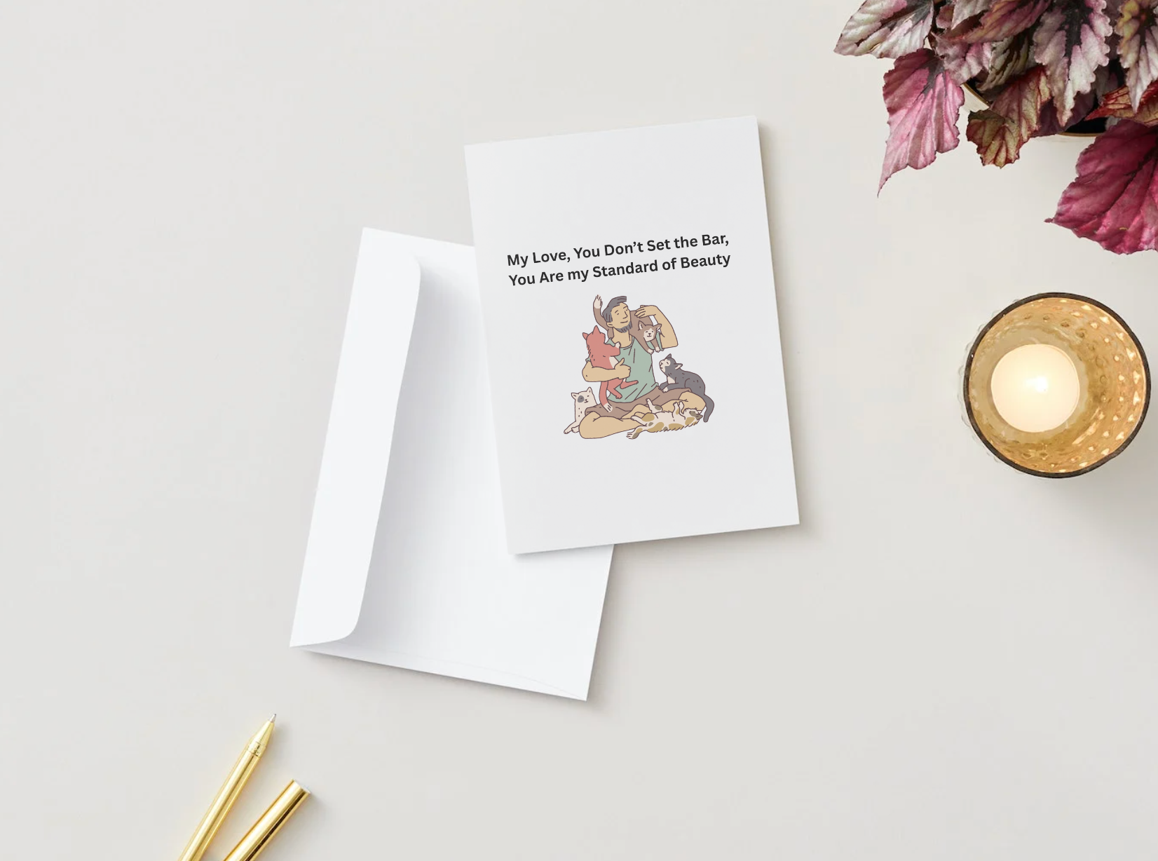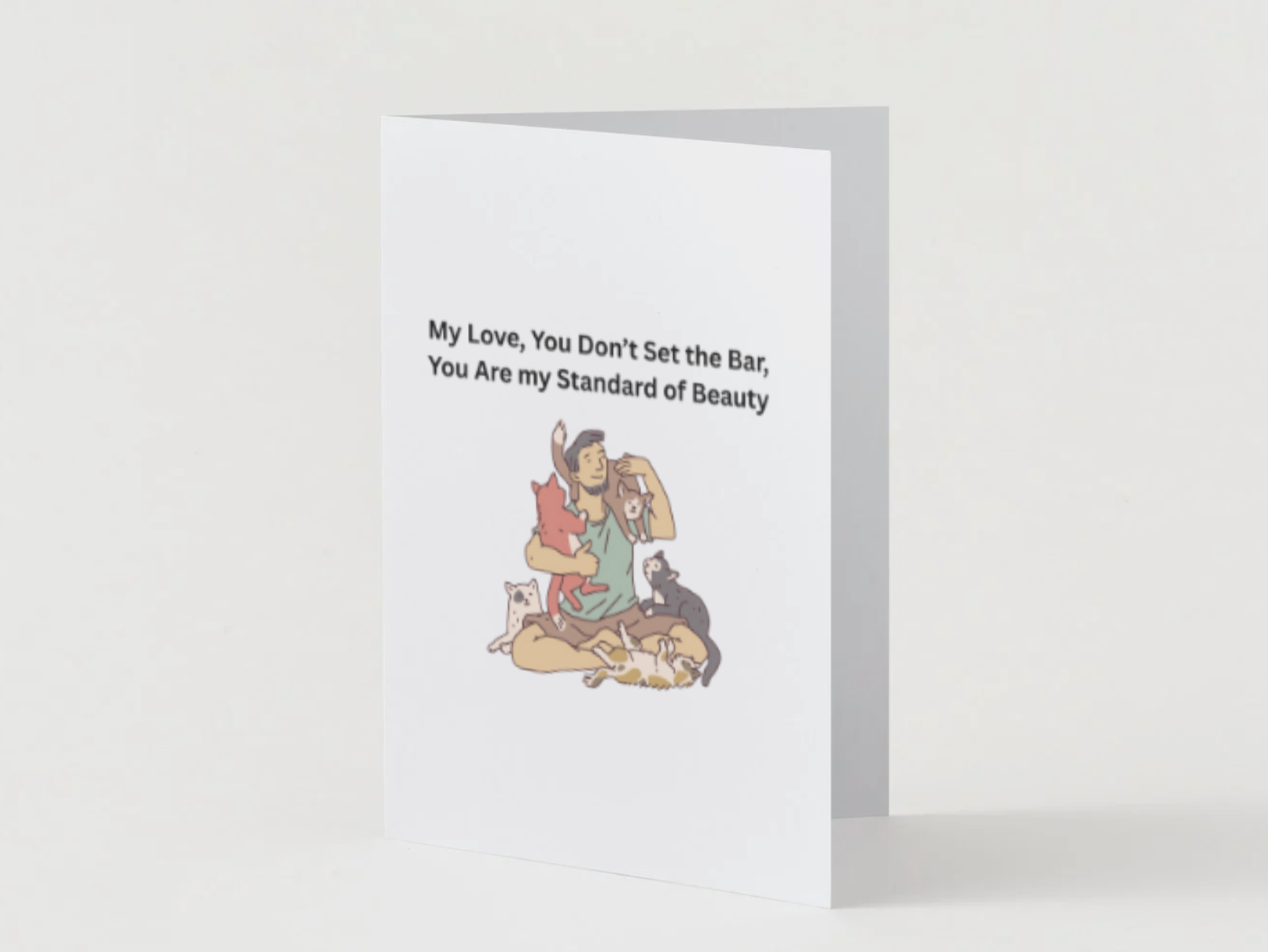 Description: Celebrate the one who rewrites the meaning of beauty with this tender, modern card. The front features the message “My Love, You Don’t Set the Bar, You Are My Standard of Beauty” alongside a sweet illustration of a man with his cats—perfect for his birthday.