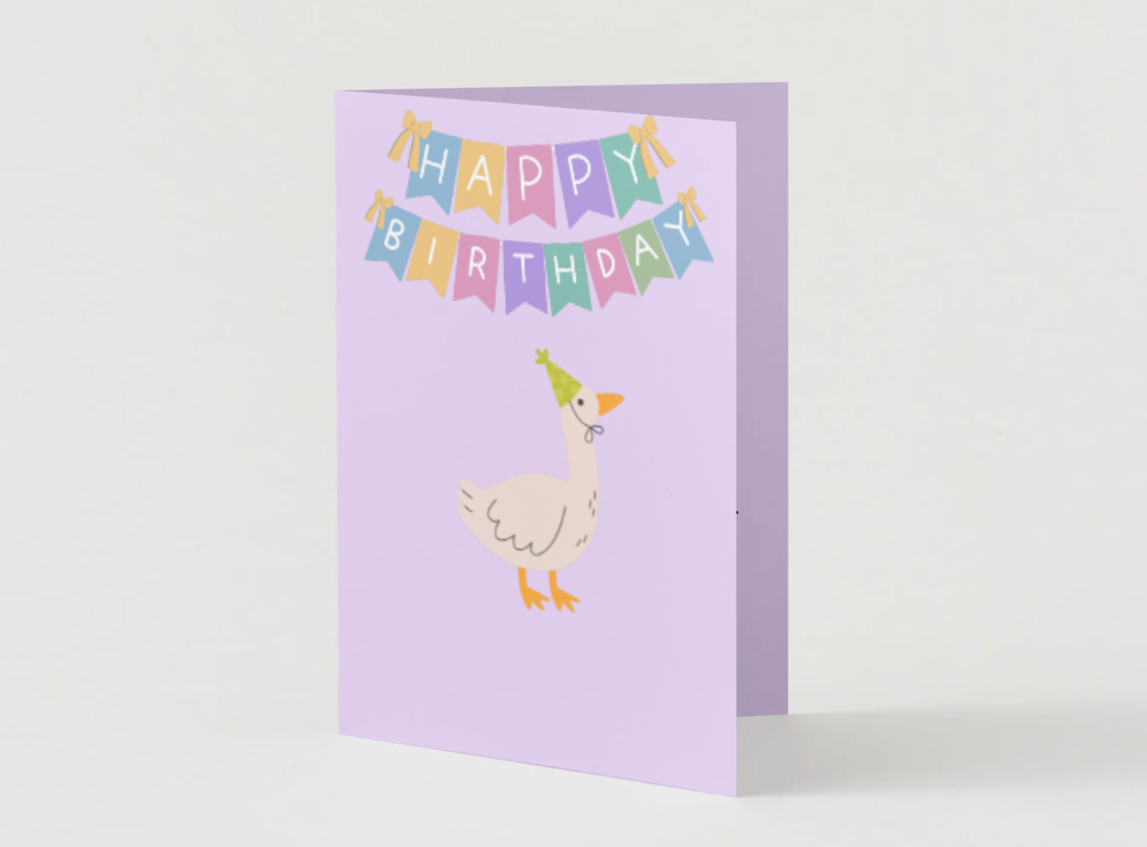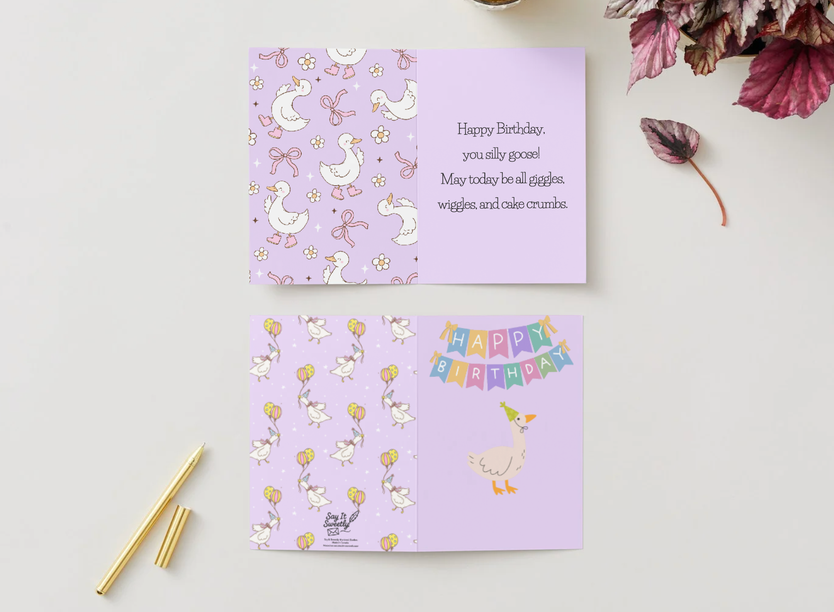 Description: A delightfully goofy birthday card starring a “silly goose” in party mode! Soft lilac, confetti banners, and sweet hand-drawn geese make it perfect for kids. Light, cheerful.