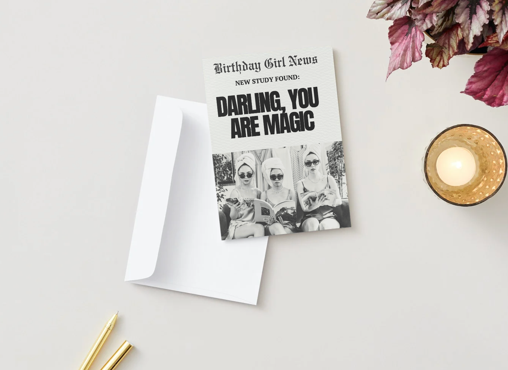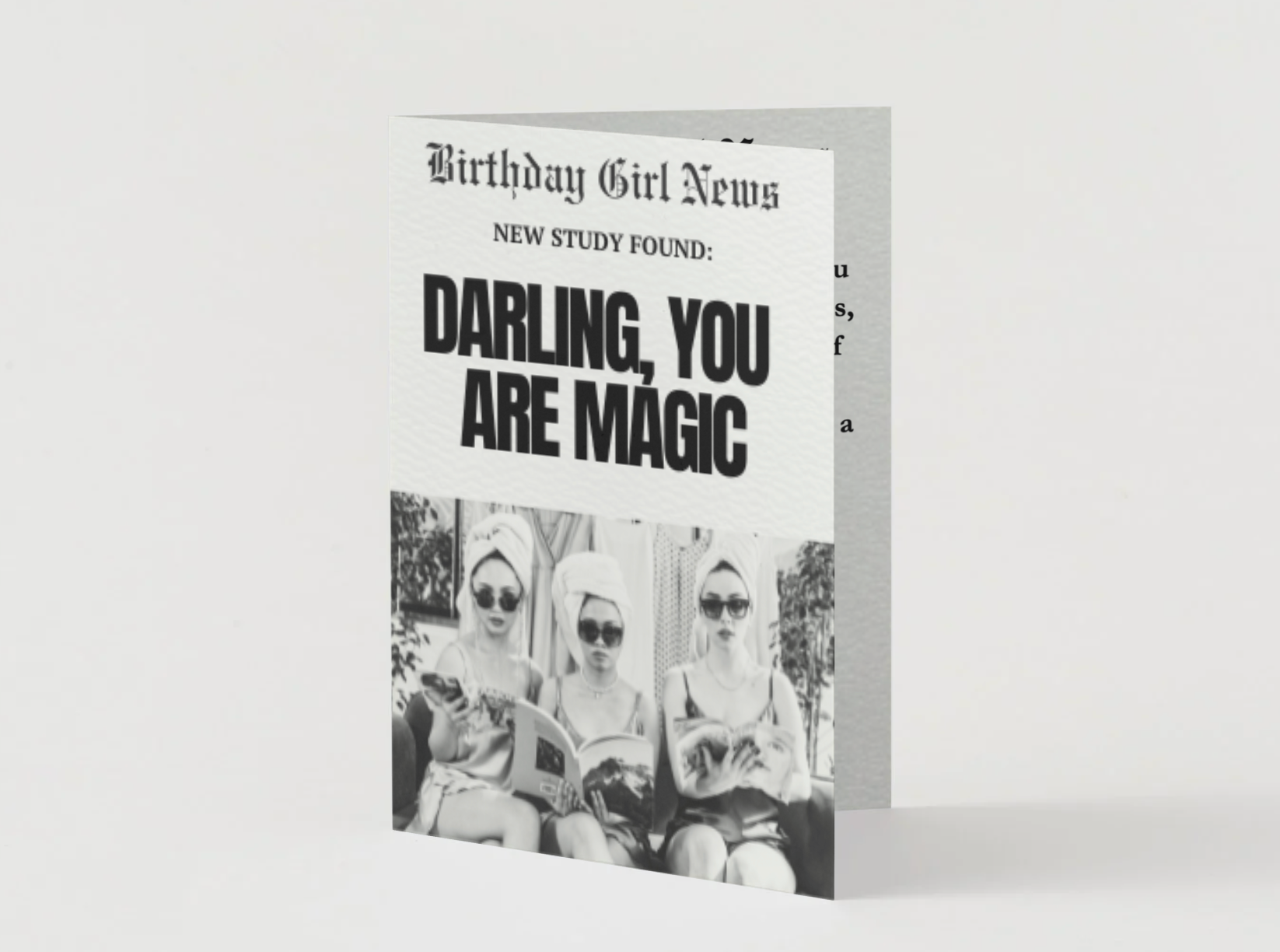 Style: Portrait fold; front reads “Birthday Girl News — New Study Found: DARLING, YOU ARE MAGIC.”; left inside panel features a retro illustration, right panel prints the message below.