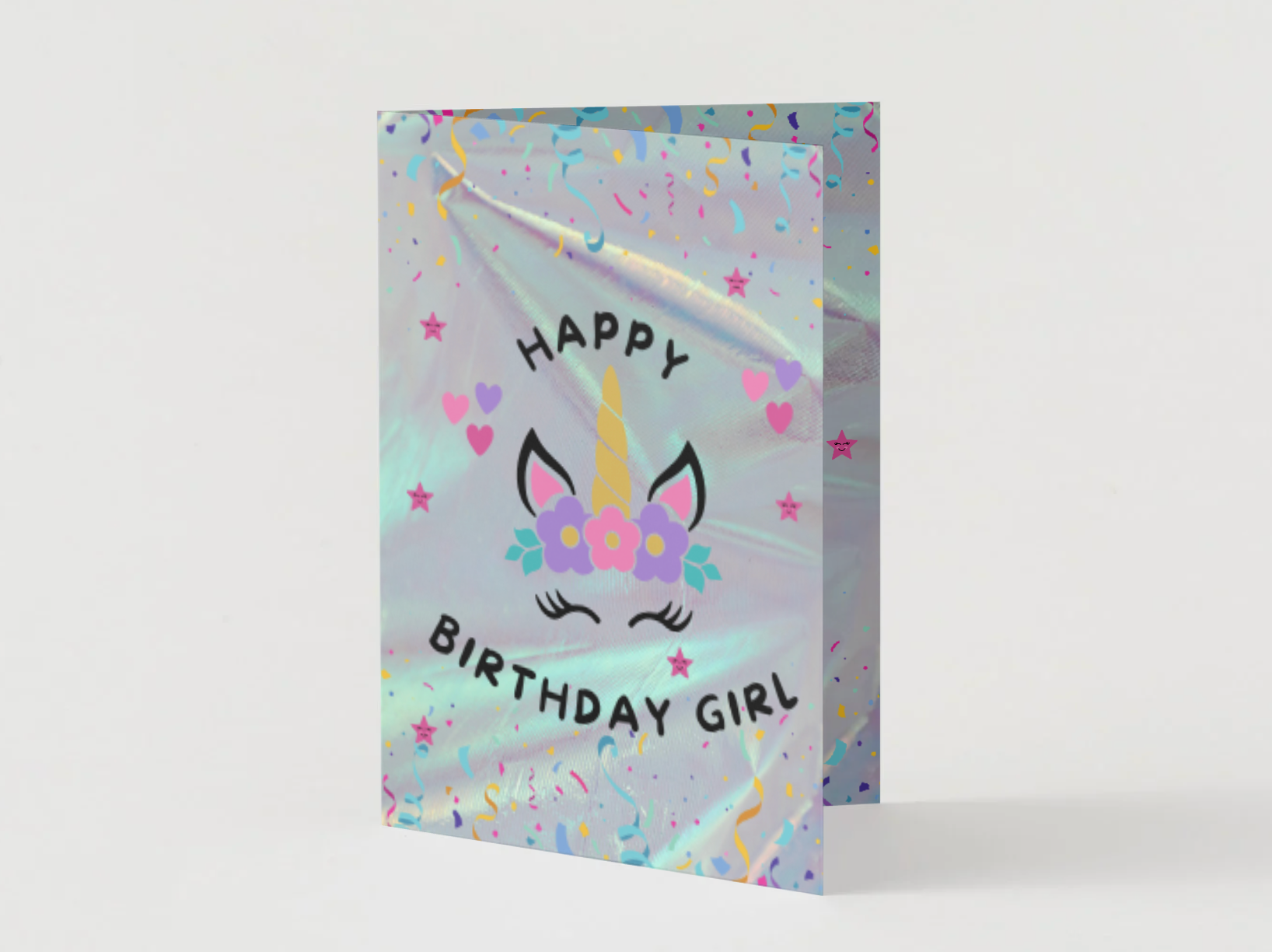 Style: Portrait fold; front reads “HAPPY BIRTHDAY GIRL” with a unicorn illustration; left inside panel left blank for your note, right panel includes a printed message.