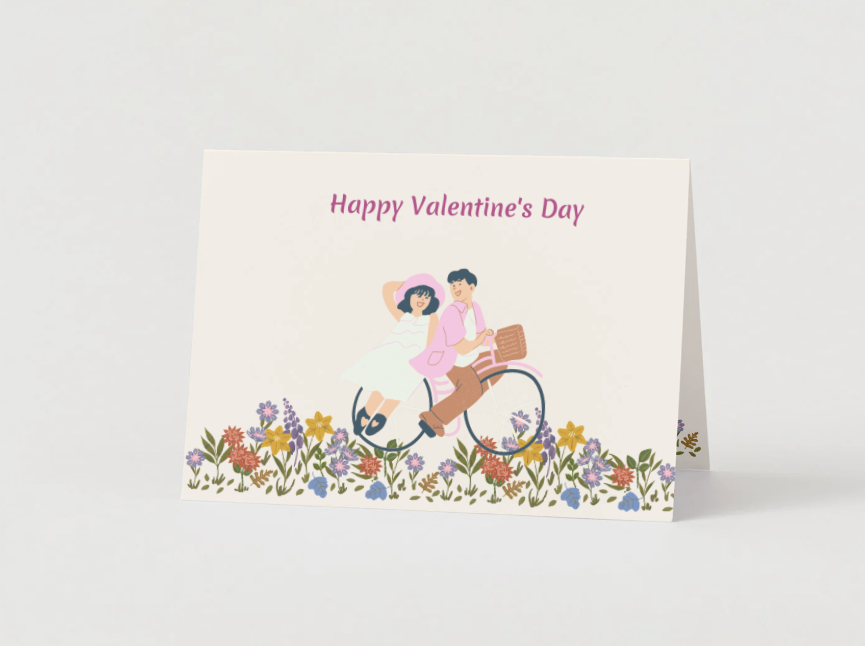 Description: A sweet Valentine’s Day card featuring an illustration of a couple with a bicycle nestled in a border of colorful flowers on a clean cream background—simple, romantic, and charming.