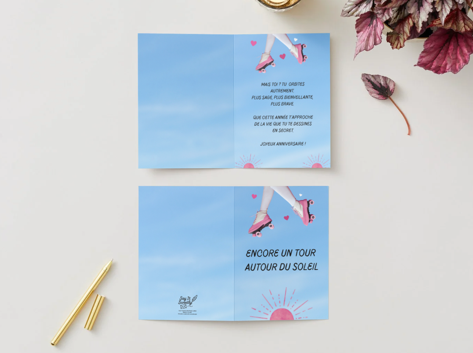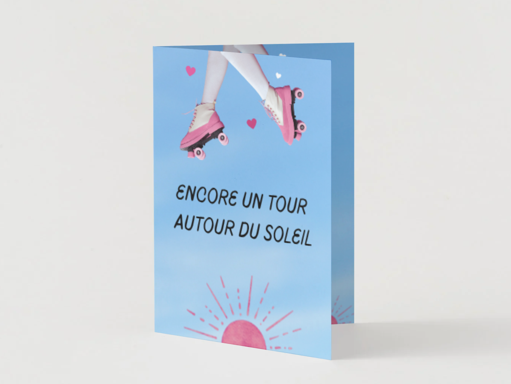 Description :Une carte d’anniversaire lumineuse au ciel bleu et esprit rétro—patins à roulettes, petits cœurs et soleil levant. Joyeuse et pleine d’élan, elle célèbre une année de plus autour du soleil avec légèreté et style.