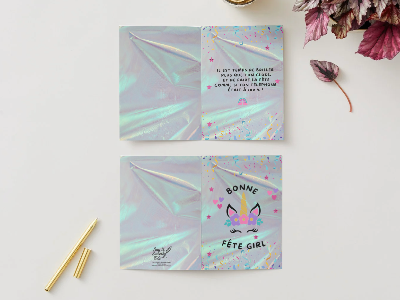 Description : Une carte d’anniversaire ultra-fun pour briller de mille feux! Motif licorne adorable sur fond holographique, lettrage ludique—parfaite pour une amie, une sœur ou toute birthday girl qui adore le glam.