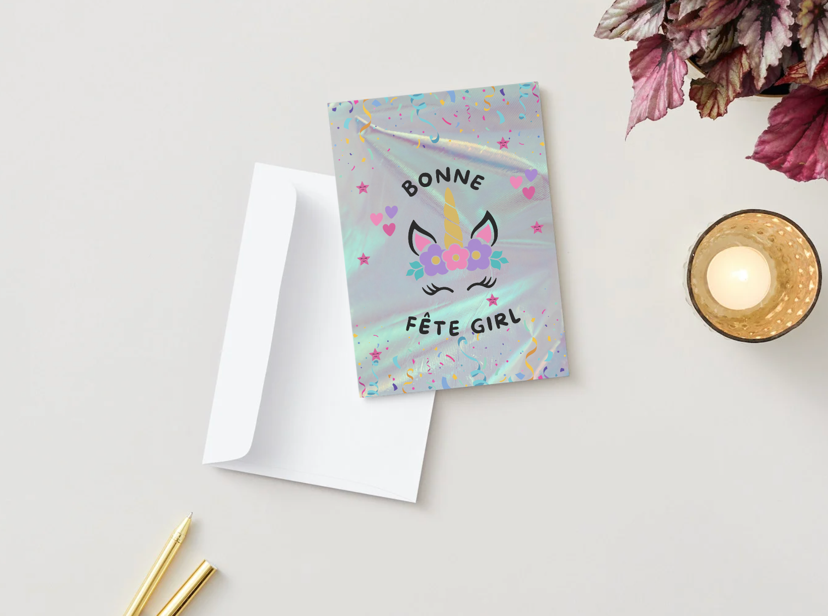 Style : Format portrait; couverture « Bonne fête girl » avec illustration de licorne sur fond holographique; volet intérieur gauche laissé blanc pour votre message; volet droit avec message imprimé.