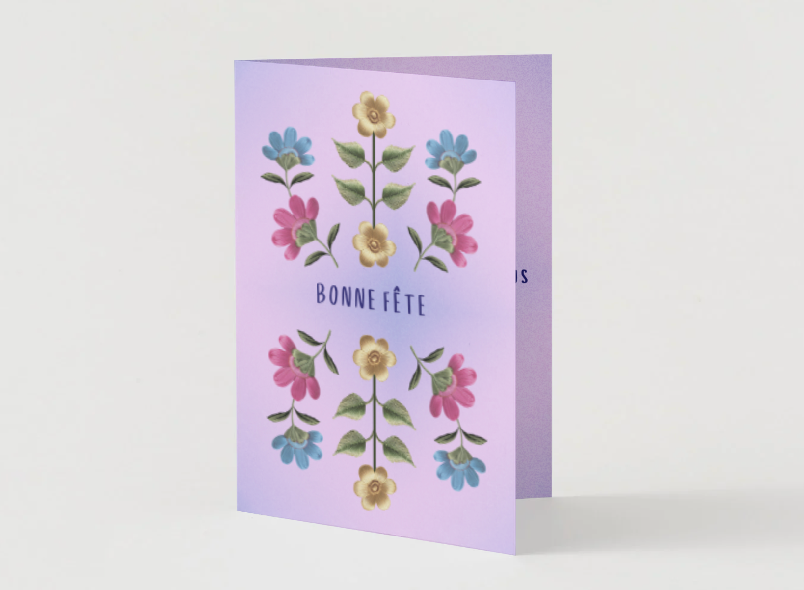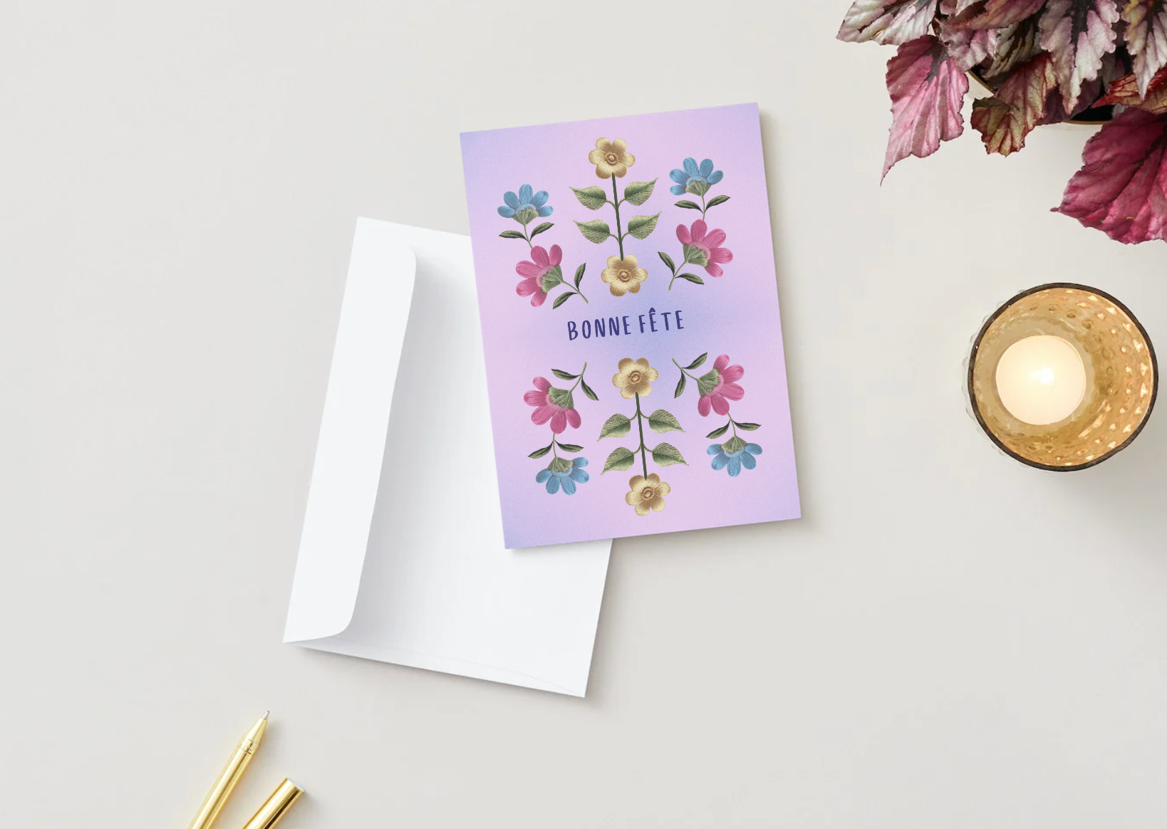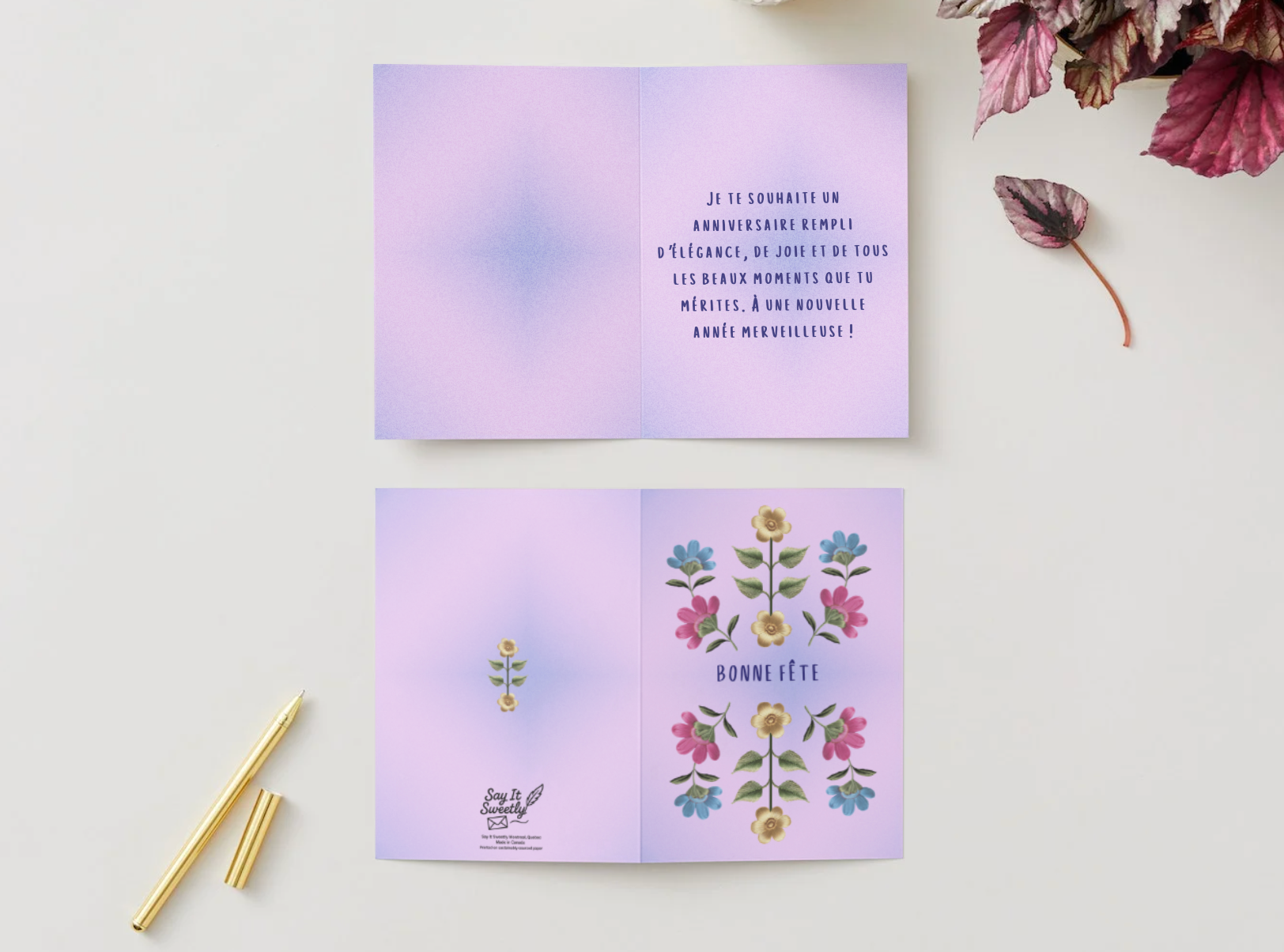 Style : Format portrait ; couverture « Bonne fête » avec bouquet floral ; volet intérieur gauche laissé blanc pour votre mot ; volet droit avec message imprimé.