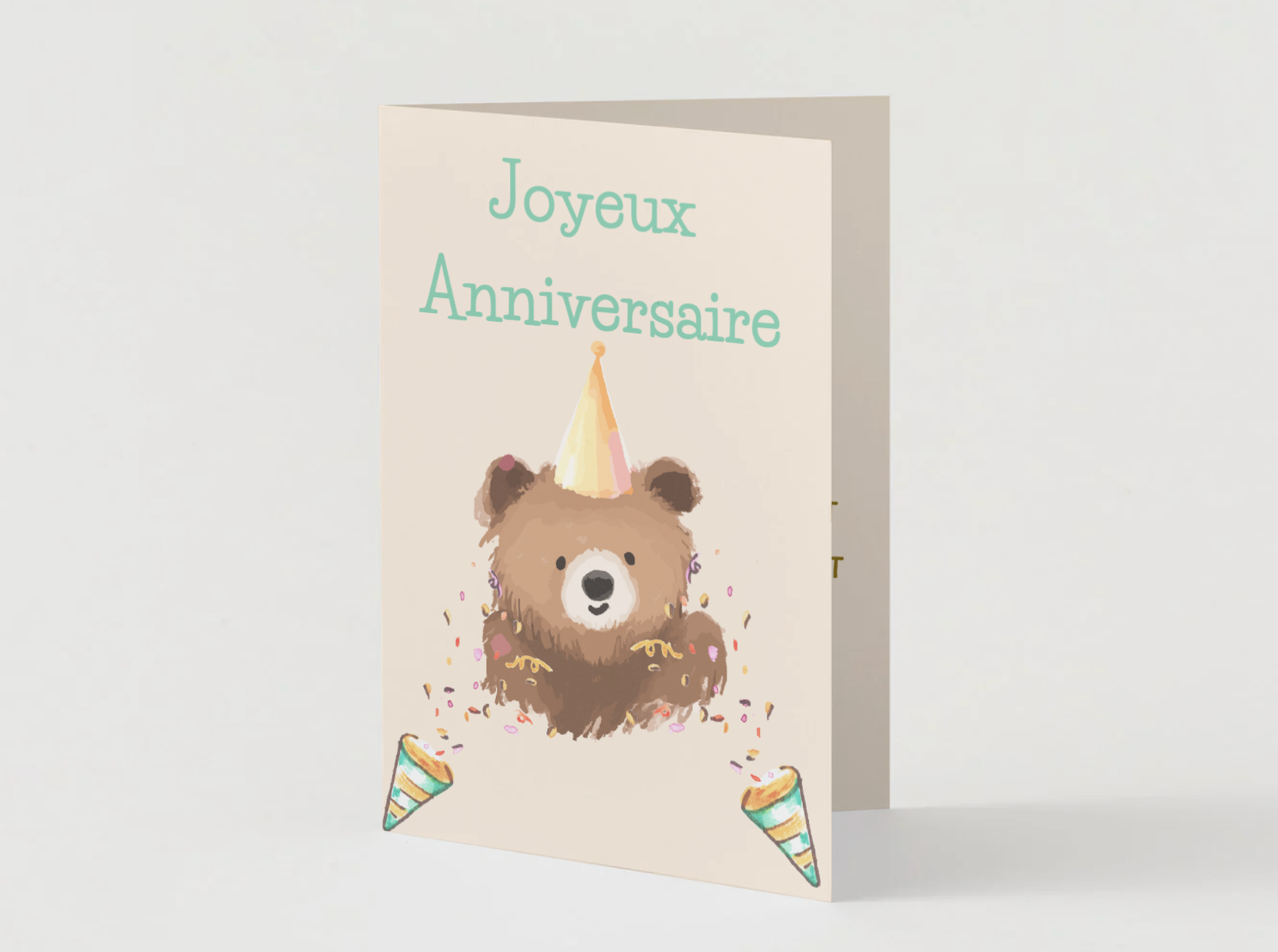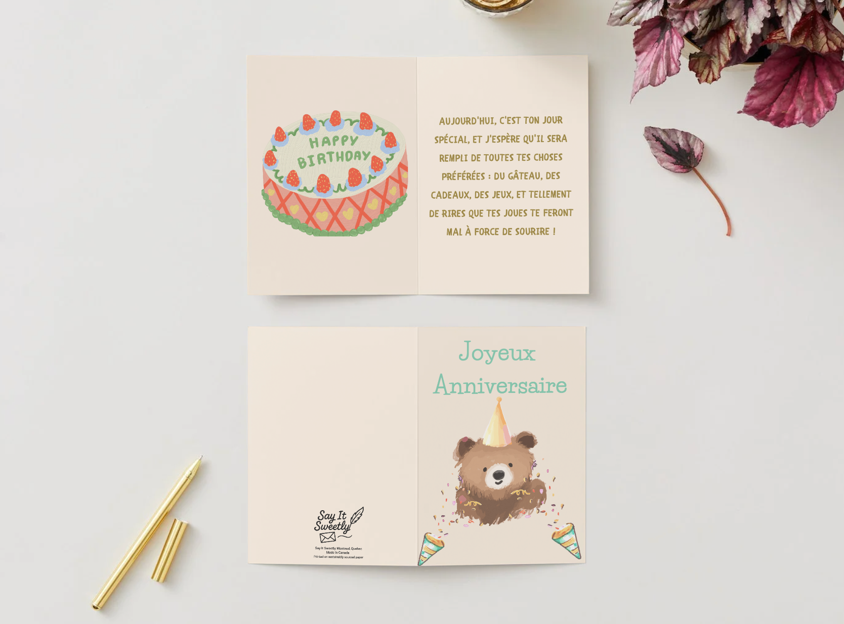 Style : Format portrait ; Devant : ourson festif avec chapeau de fête, confettis et la mention « Joyeux Anniversaire ». Intérieur gauche : grande illustration de gâteau d’anniversaire « Happy Birthday ». Intérieur droit : texte imprimé en français.