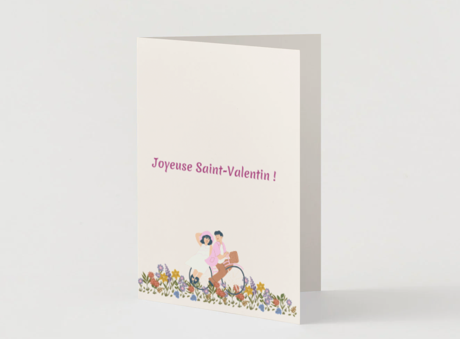 Description: Une carte romantique et délicate pour dire « je t’aime » : couple à vélo au-dessus d’une bordure de fleurs, typographie rose tendre « Joyeuse Saint-Valentin ! ». Parfaite pour votre moitié, pour une demande spéciale ou simplement pour célébrer l’amour.