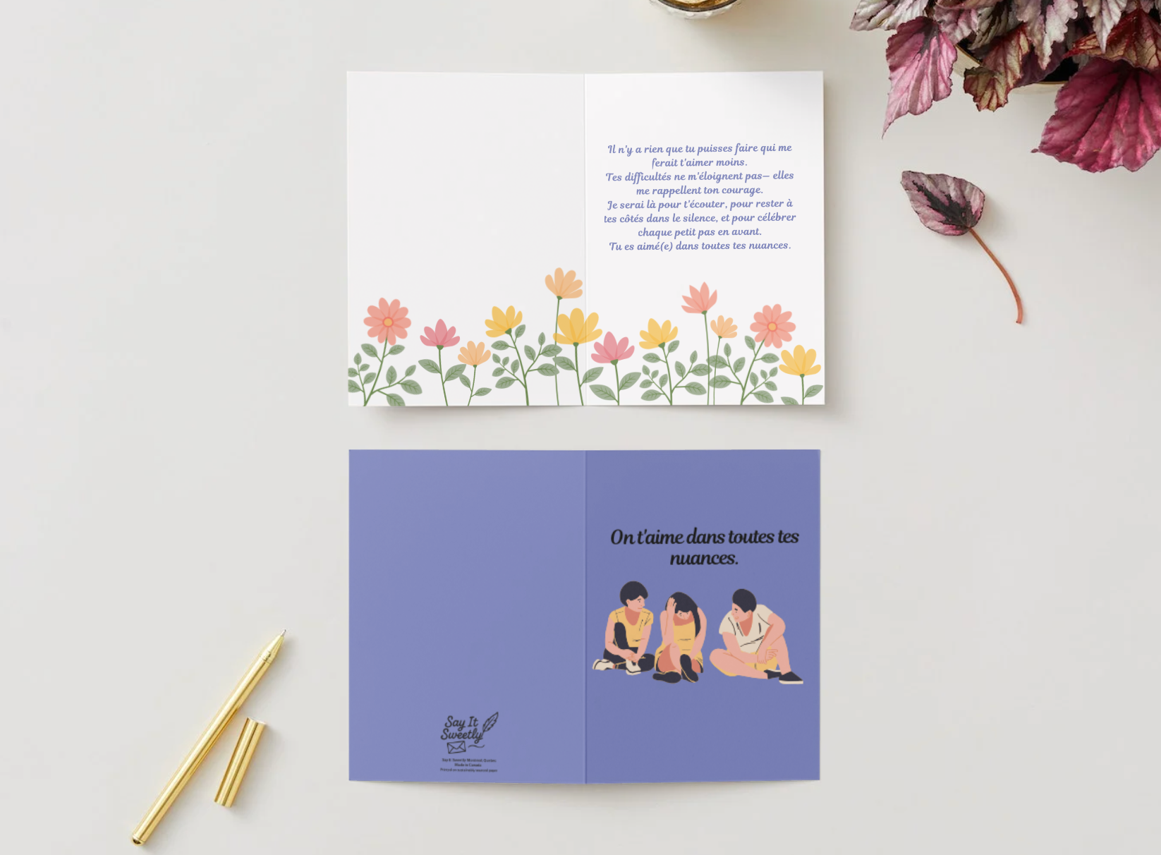 Description: Une carte tendre et inclusive pour rappeler à quelqu’un qu’il/elle est aimé(e) tel(le) qu’il/elle est, dans toutes ses couleurs et humeurs. Devant minimaliste avec une illustration douce, intérieur fleuri et message réconfortant.