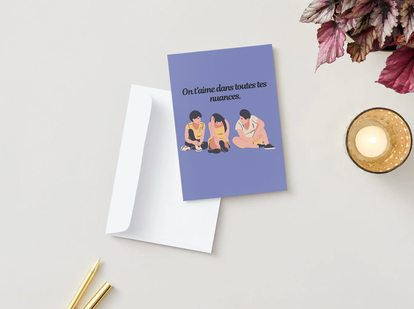 Style : Pli portrait ; recto : « On t’aime dans toutes tes nuances. » avec illustration ; volet intérieur gauche avec fleurs et espace pour votre mot ; volet intérieur droit avec message imprimé et frise florale.