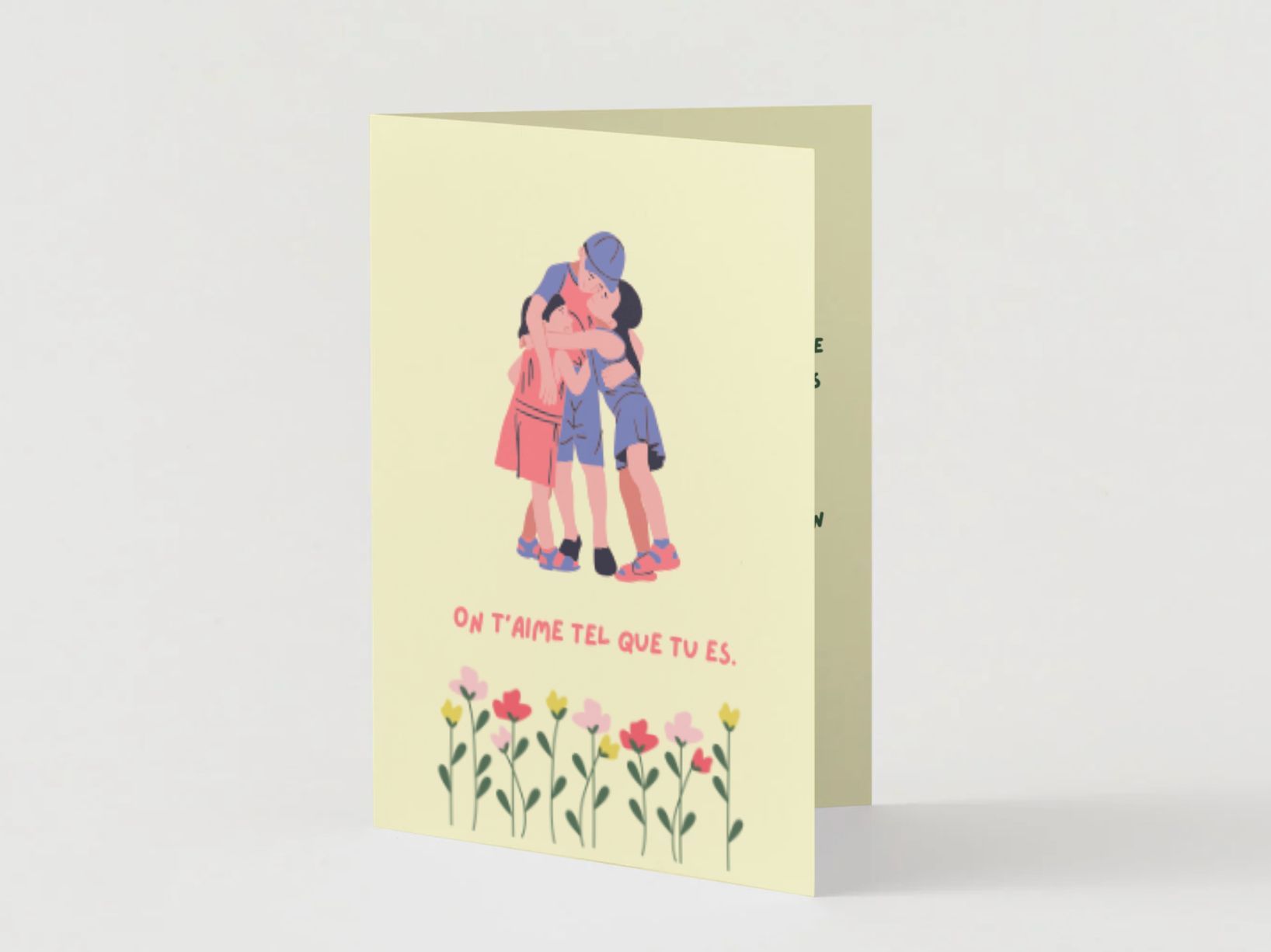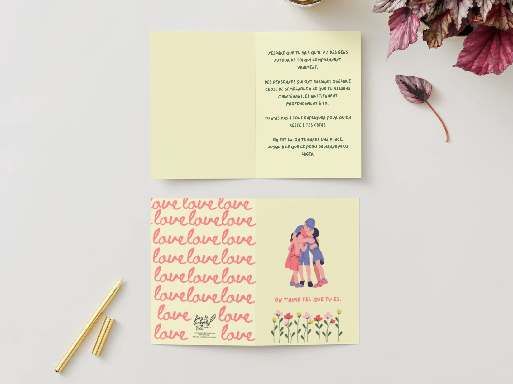 Description: Une carte de soutien tendre et inclusive pour rappeler à quelqu’un qu’iel est aimé·e exactement tel·le qu’iel est. Motif « love » manuscrit, illustration d’un câlin de groupe et message réconfortant — idéale pour traverser une période difficile avec douceur.