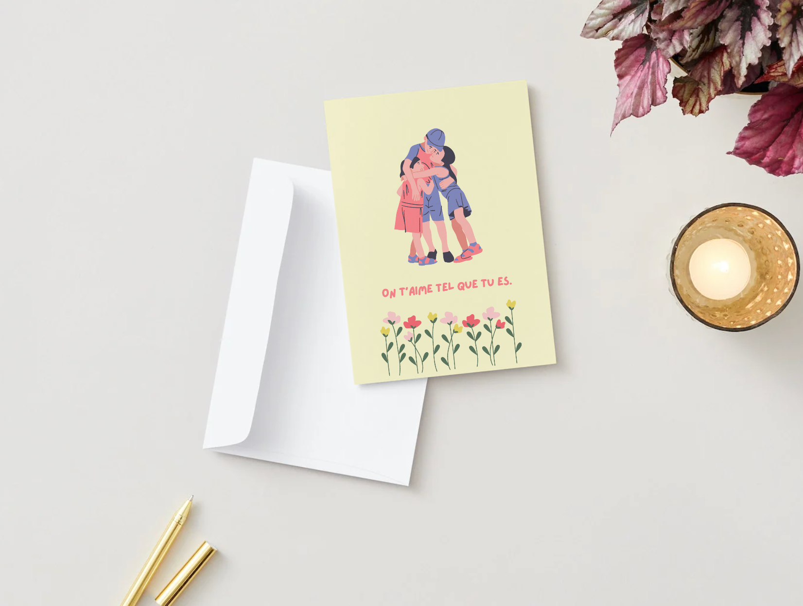 Style : Pli portrait ; recto : titre « On t’aime tel que tu es » avec illustration ; intérieur gauche : motif « love » (espace pour votre mot) ; intérieur droit : message imprimé.