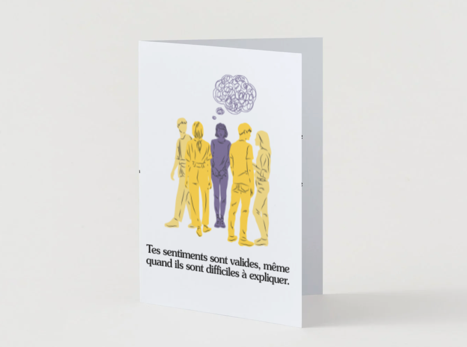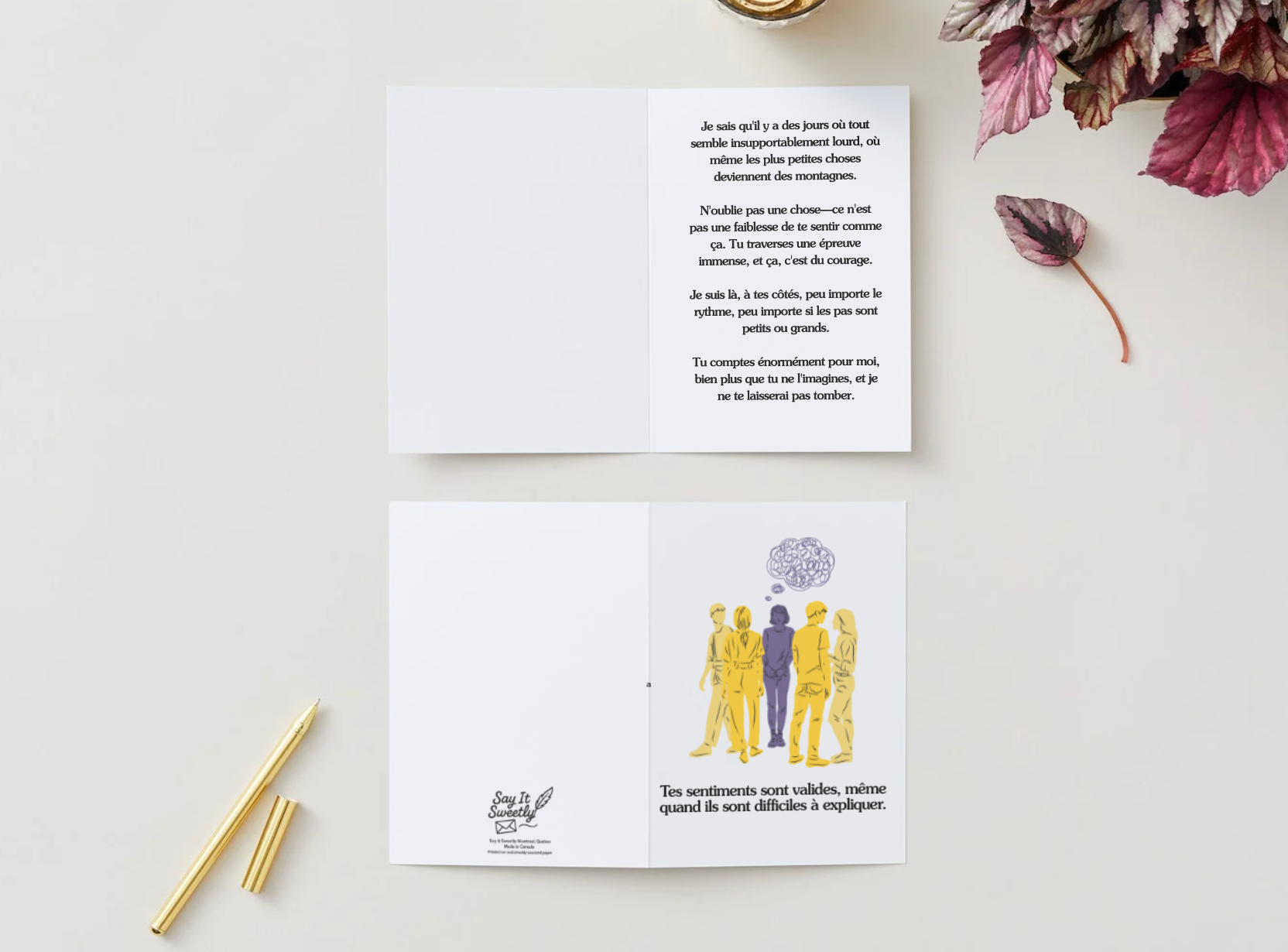 Description: Une carte de soutien douce et sans jugement pour quelqu’un qui traverse une période lourde. Illustration sensible et message réconfortant pour rappeler que ses émotions comptent et qu’iel n’est pas seul·e.