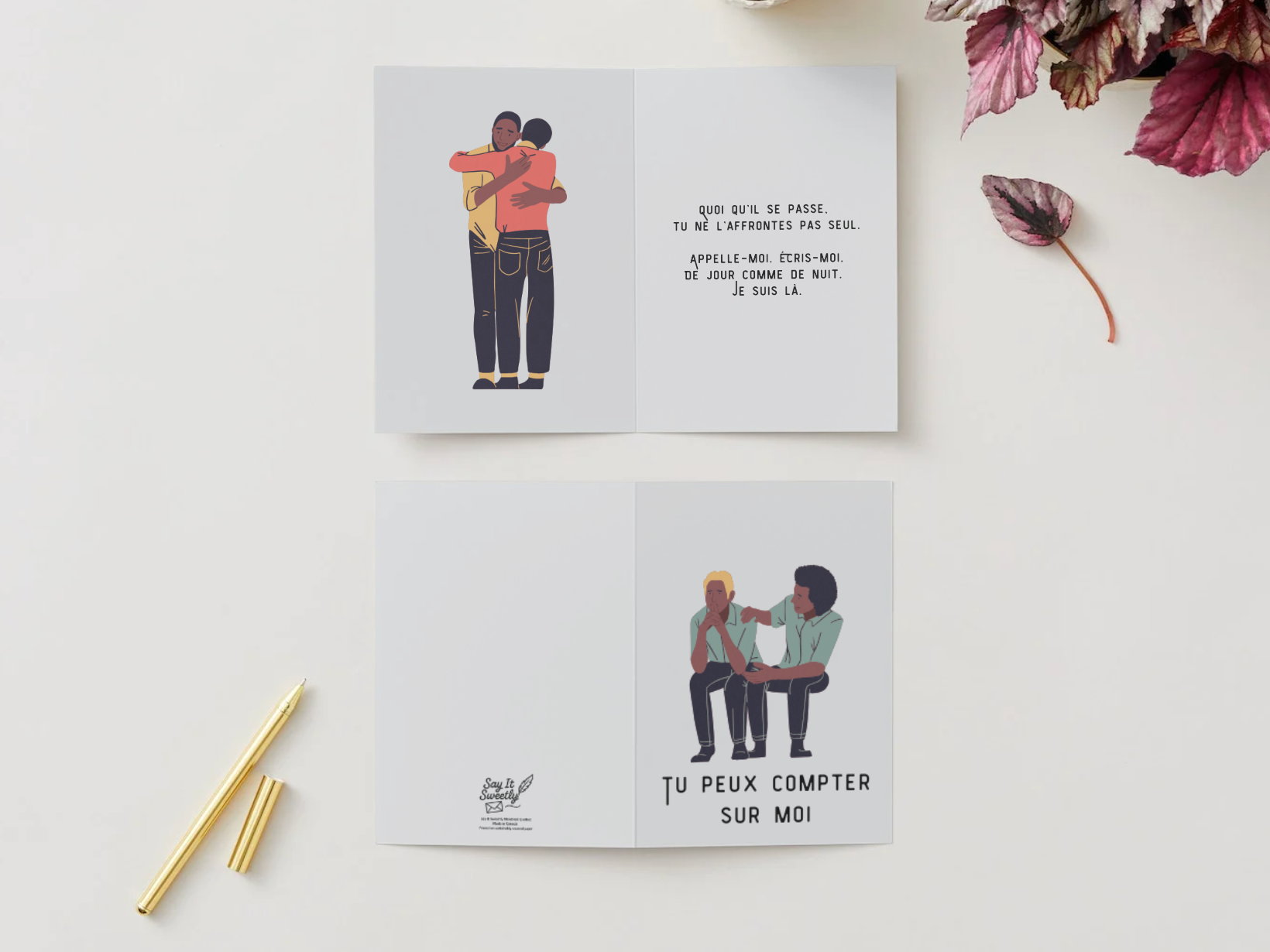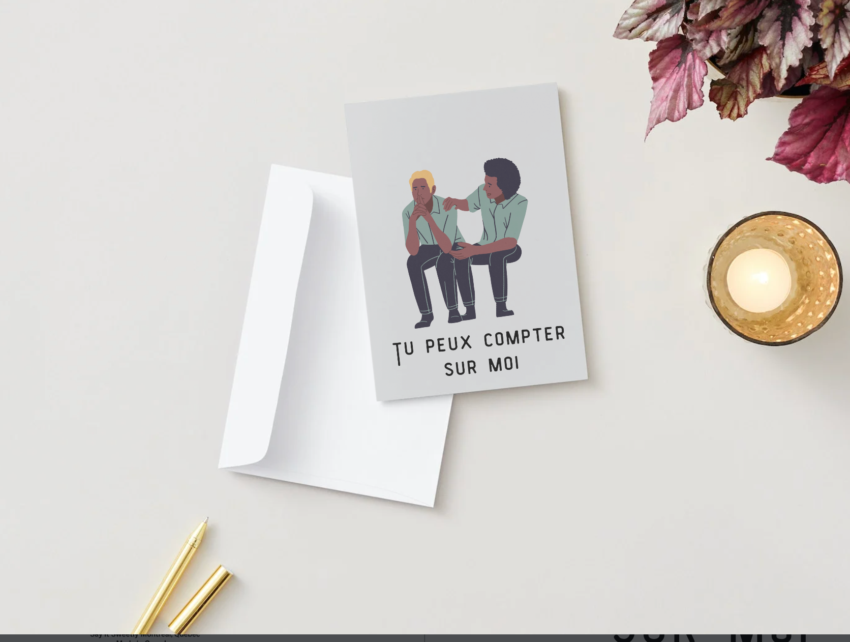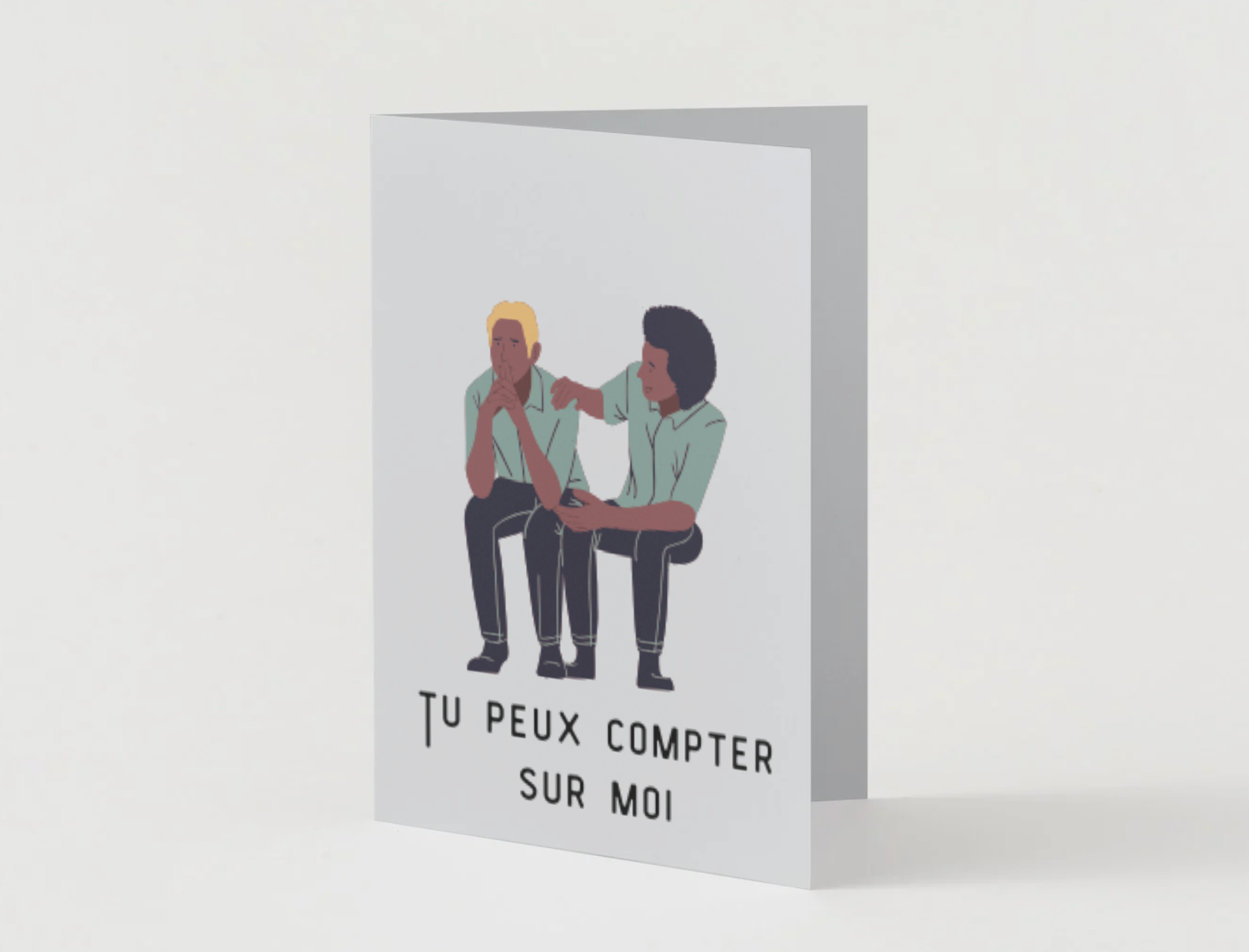 Une carte simple et chaleureuse pour dire « je suis là ». Illustration de deux amis côte à côte sur fond gris doux et typographie affirmée « Tu peux compter sur moi ». Idéale pour accompagner quelqu’un dans une période difficile ou pour un petit mot d’encouragement.
