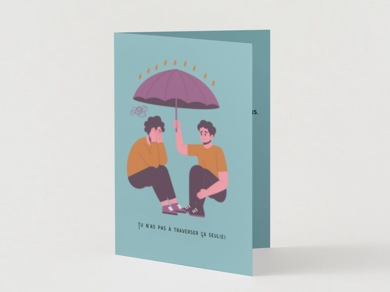 Style : Pli vertical (portrait) ; couverture avec l’illustration et le message « Tu n’as pas à traverser ça seul(e) » ; intérieur gauche vierge pour votre mot, panneau droit avec texte imprimé.