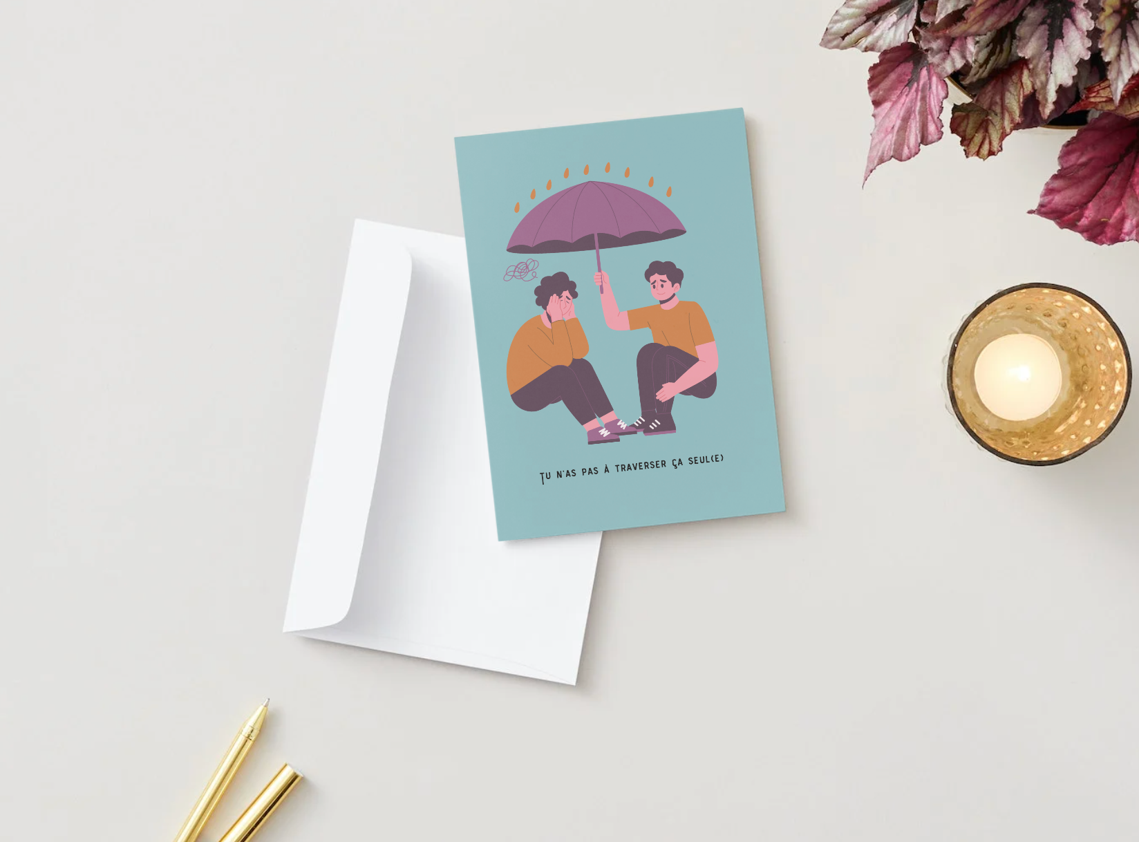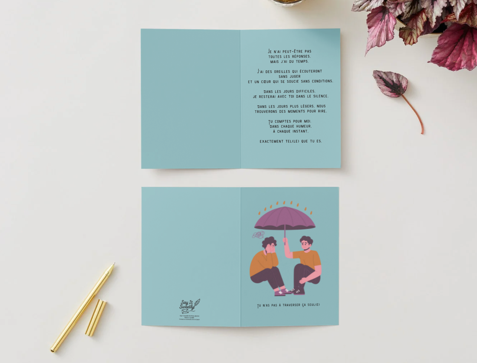 Description: Une carte douce et rassurante pour dire « je suis là ». Illustration de deux amis partageant un parapluie sur fond bleu tendre et affirmation apaisante en couverture. Idéale pour accompagner quelqu’un pendant une période difficile ou pour un simple mot d’encouragement.