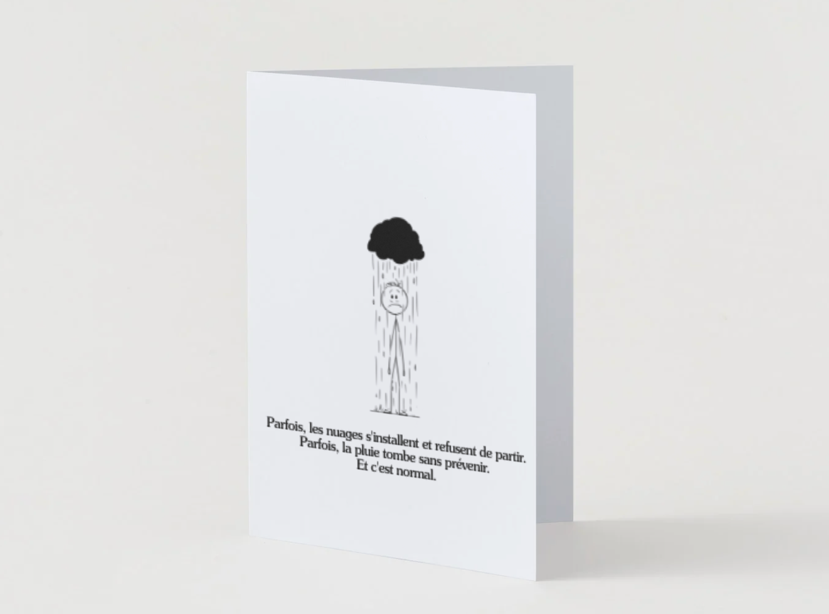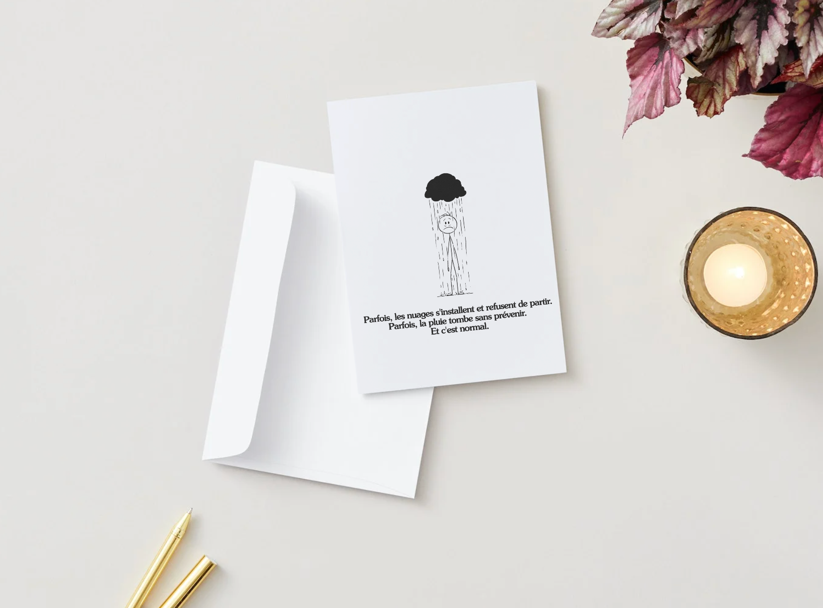 Style : Format portrait plié ; couverture avec illustration nuage/pluie et texte réconfortant ; intérieur droit imprimé, panneau gauche laissé blanc pour votre mot.