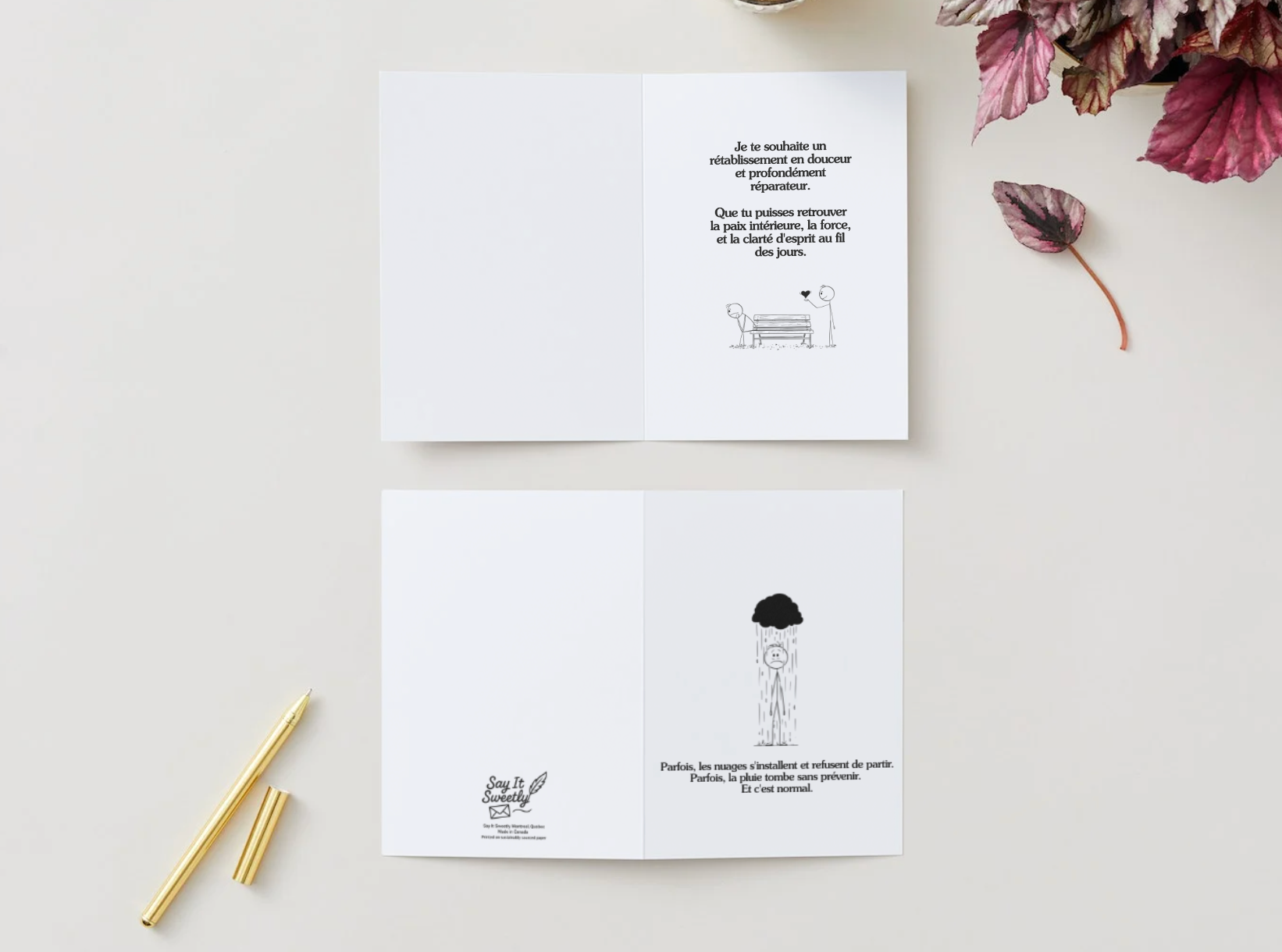 Description: Minimaliste, douce et bienveillante, cette carte en noir et blanc met des mots simples sur les jours gris. Parfaite pour accompagner un rétablissement, une période difficile ou simplement dire « je pense à toi » sans lourdeur. Illustrations épurées, message chaleureux—un petit geste qui fait beaucoup.