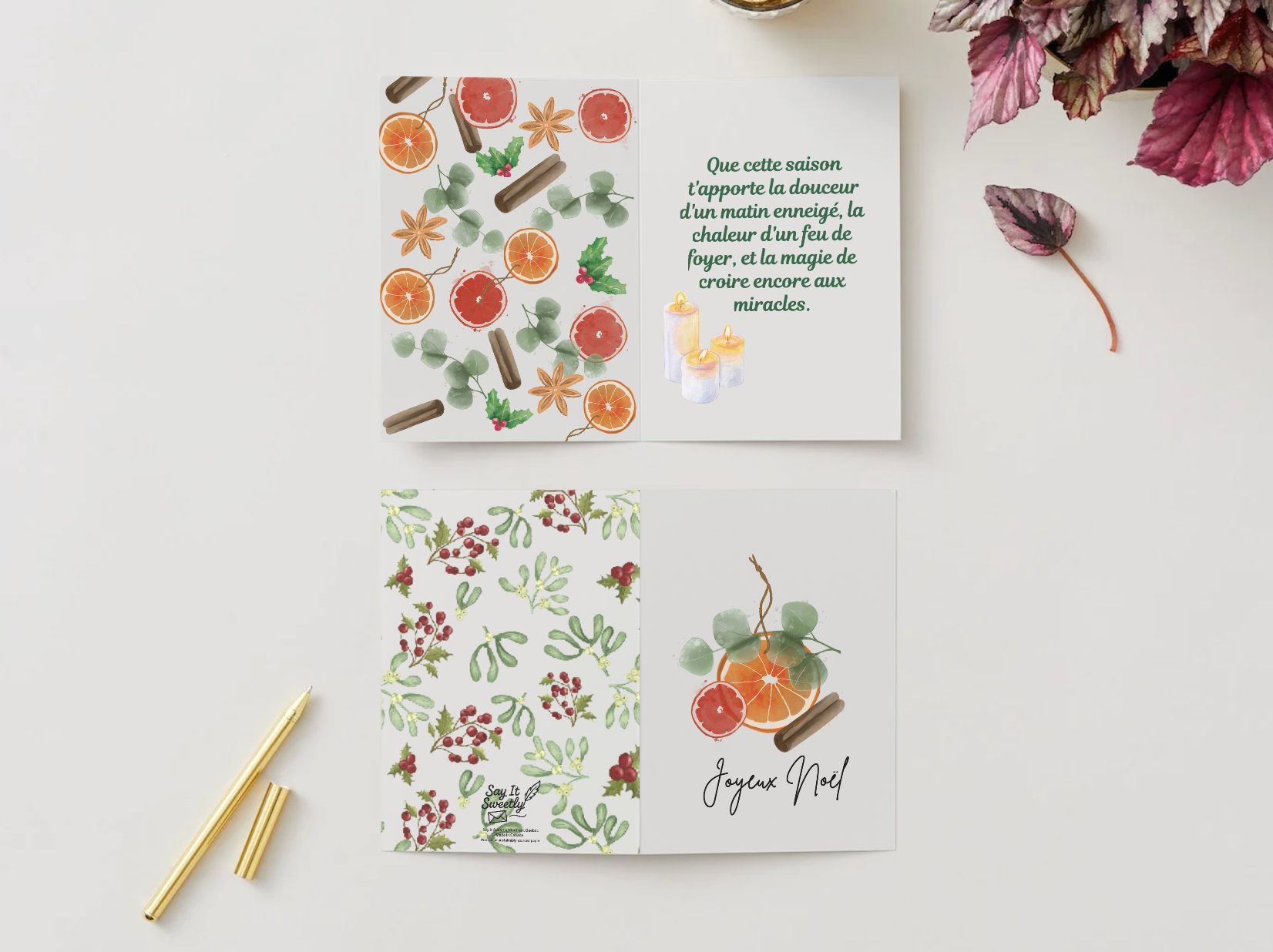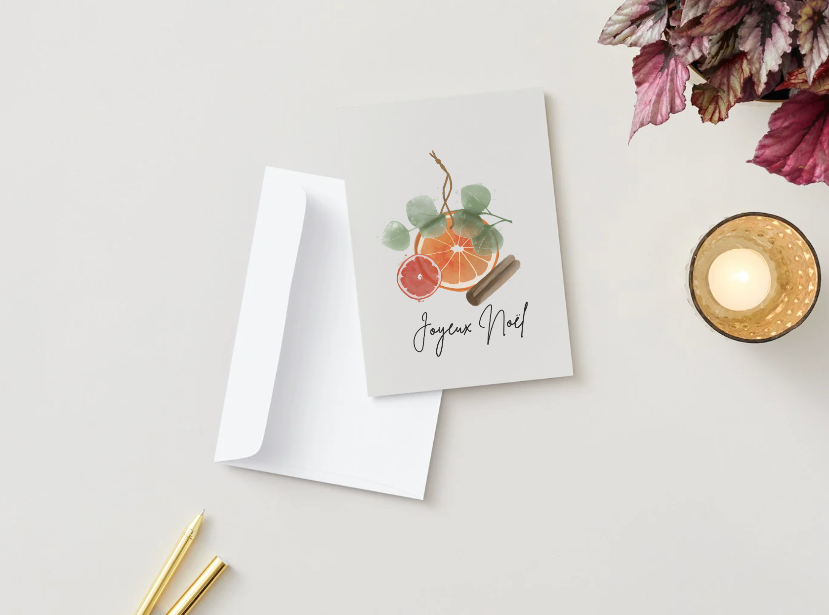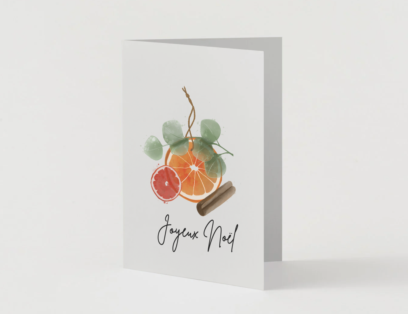 Description: Offrez une ambiance chaleureuse des Fêtes avec cette carte « Joyeux Noël » inspirée des cocottes parfumées : tranches d’agrumes, bâtons de cannelle, anis étoilé et eucalyptus. Parfaite pour envoyer des vœux doux et réconfortants à la famille et aux amis.