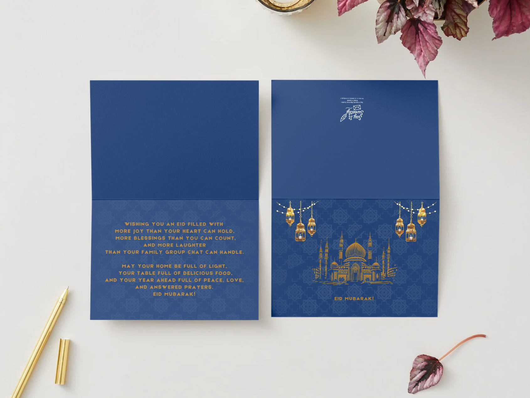 Message inside: "Wishing you an Eid filled with more joy than your heart can hold, more blessings than you can count, and more laughter than your family group chat can handle. May your home be full of light, your table full of delicious food, and your year ahead full of peace, love, and answered prayers. Eid Mubarak!"