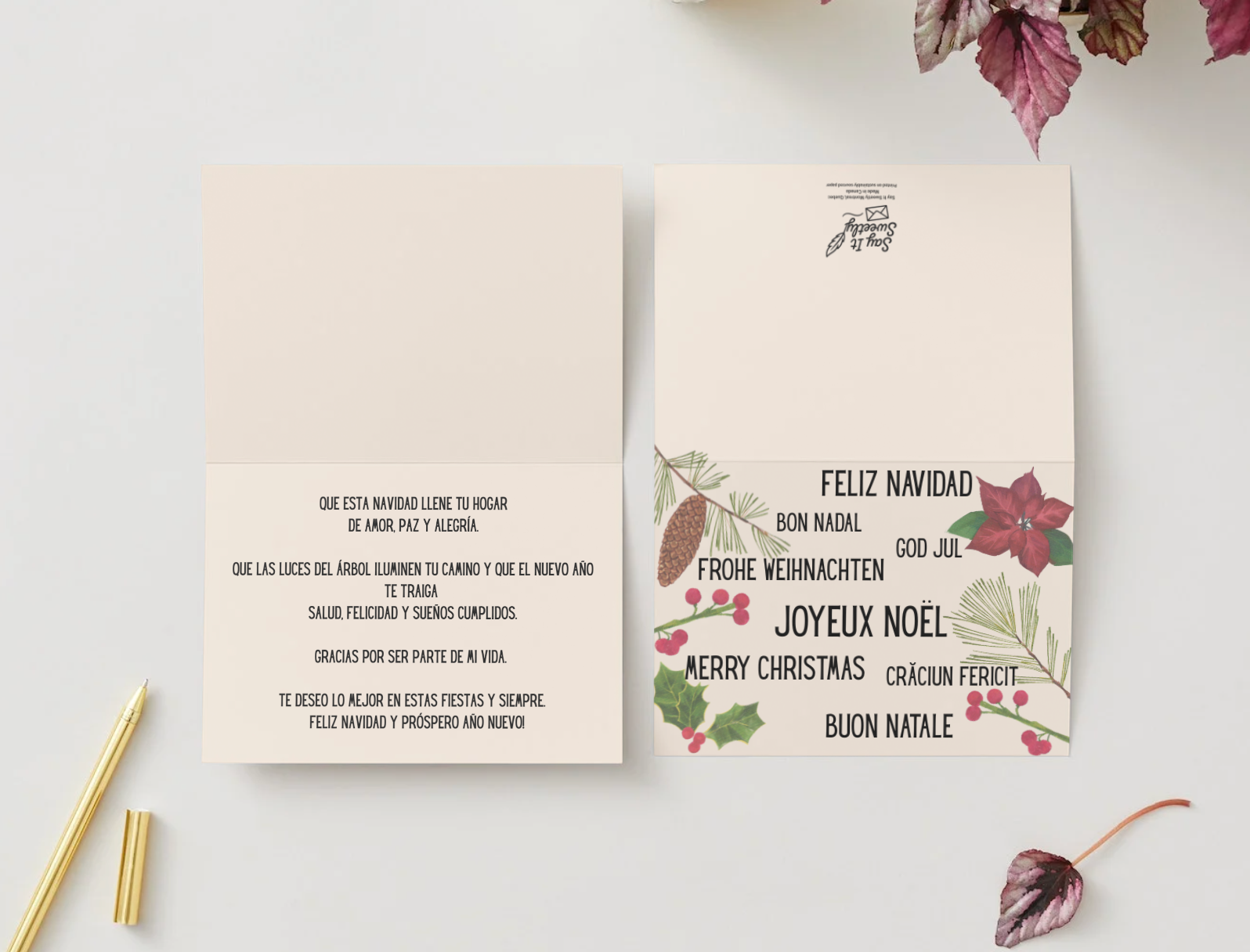 Send festive cheer in many languages! This elegant cream card features a botanical collage of pine, holly, berries, a pinecone, and a poinsettia, paired with holiday greetings. Warm and worldly—perfect for friends and family everywhere.