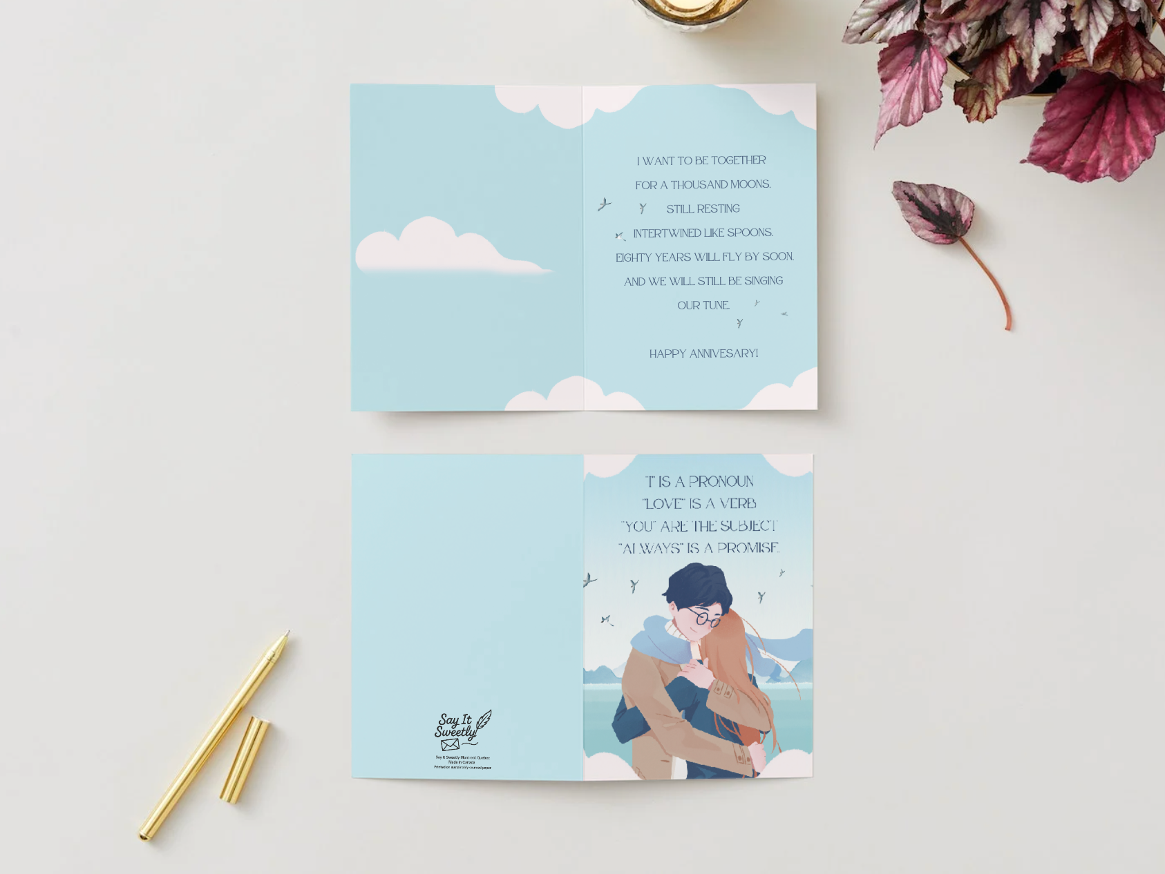 Description: This thoughtful anniversary card features a beautiful and tender illustration of a couple embracing against a serene, light blue background with wispy clouds and distant birds. Its gentle colors and powerful message make it ideal for a partner who appreciates thoughtful, poetic gestures.