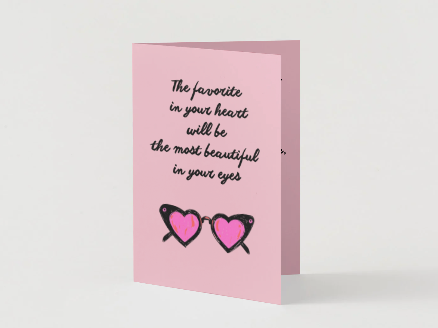Description: This charming Valentine's Day card features a soft pink background with a heartfelt message and a whimsical illustration. The front of the card has a simple drawing of heart-shaped sunglasses in bold pink and black.