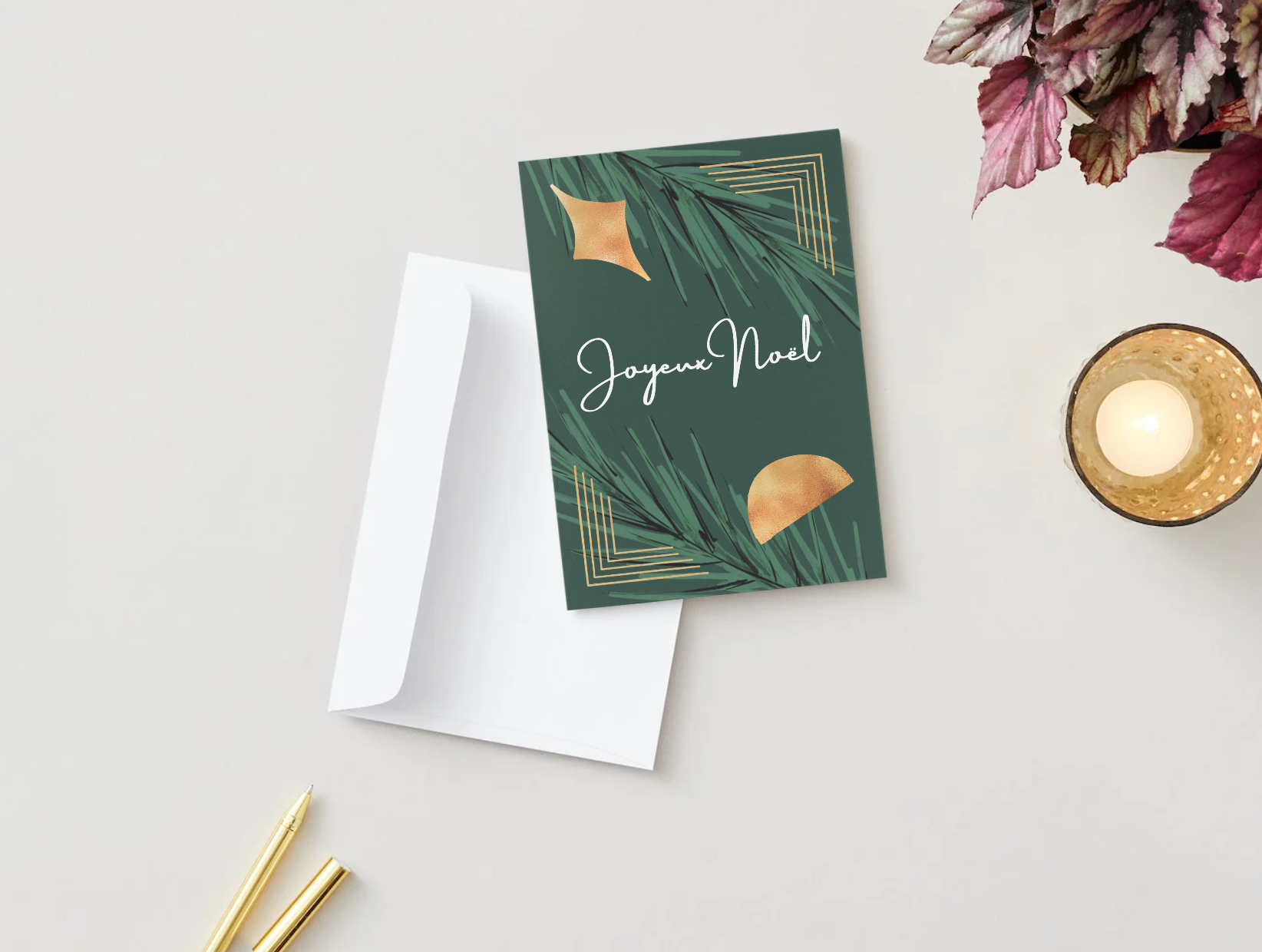 Description: Apportez une touche chic aux Fêtes avec cette carte « Joyeux Noël » : épines d’épicéa, accents dorés et mise en page élégante sur fond vert sapin. Idéale pour transmettre des vœux raffinés à la famille, aux amis ou aux collègues.