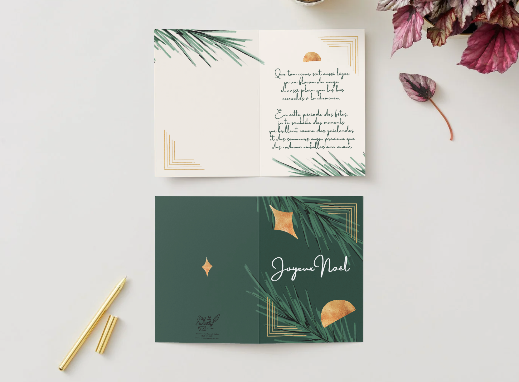 Style : Pli vertical (portrait) ; couverture « Joyeux Noël » avec motifs d’épicéa et éléments dorés ; intérieur gauche décoratif, panneau droit avec message imprimé.