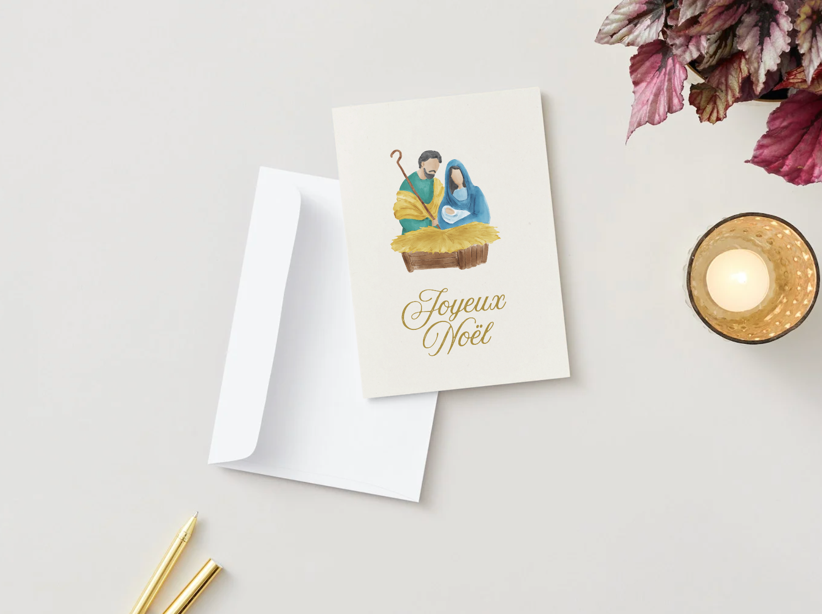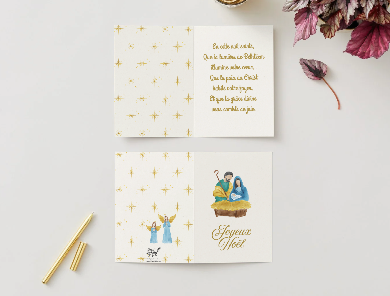 Description: Partagez la magie de Noël avec cette carte chaleureuse « Joyeux Noël », mettant en scène la Sainte Famille et deux anges sur un fond parsemé d’étoiles dorées. Une façon élégante d’envoyer de tendres vœux à vos proches pour célébrer la Nativité.