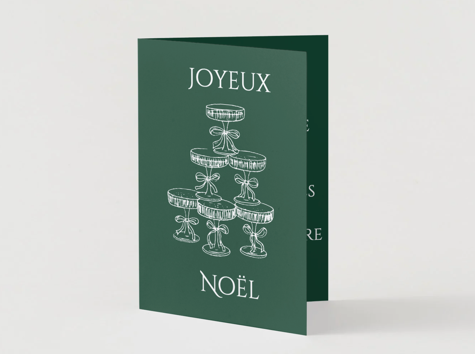 Description: Une carte festive et moderne : fond vert sapin, illustrations au trait blanc (boules disco, coupes de champagne qui s’entrechoquent et pyramide de coupes) et lettrage élégant « Joyeux Noël ». Parfaite pour souhaiter des fêtes pétillantes aux amis, collègues ou à la famille.
