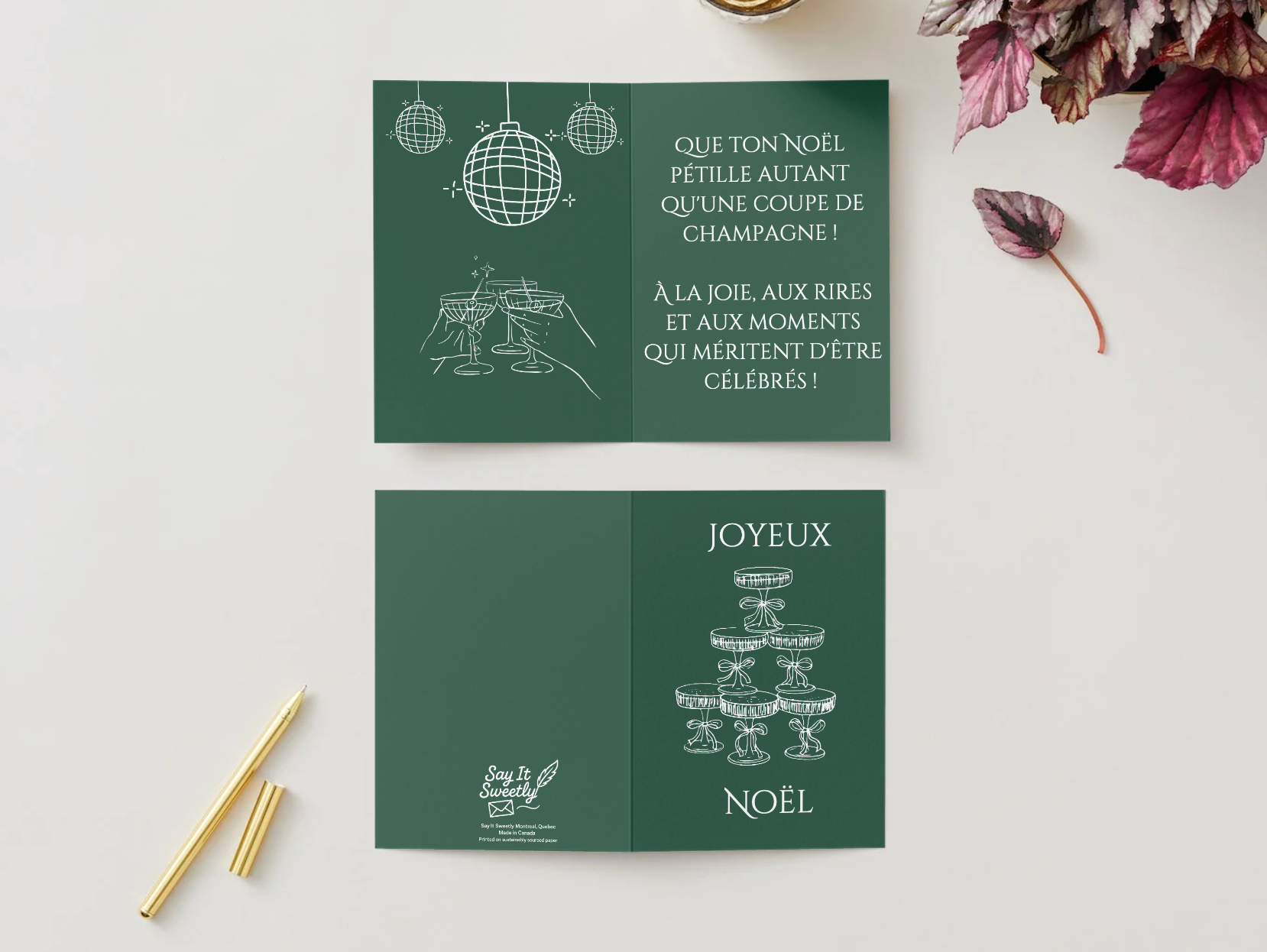 Style : Pli vertical (portrait) ; couverture « Joyeux Noël » avec pyramide de coupes ; intérieur illustré à gauche (boules disco et toast), panneau droit avec message imprimé.