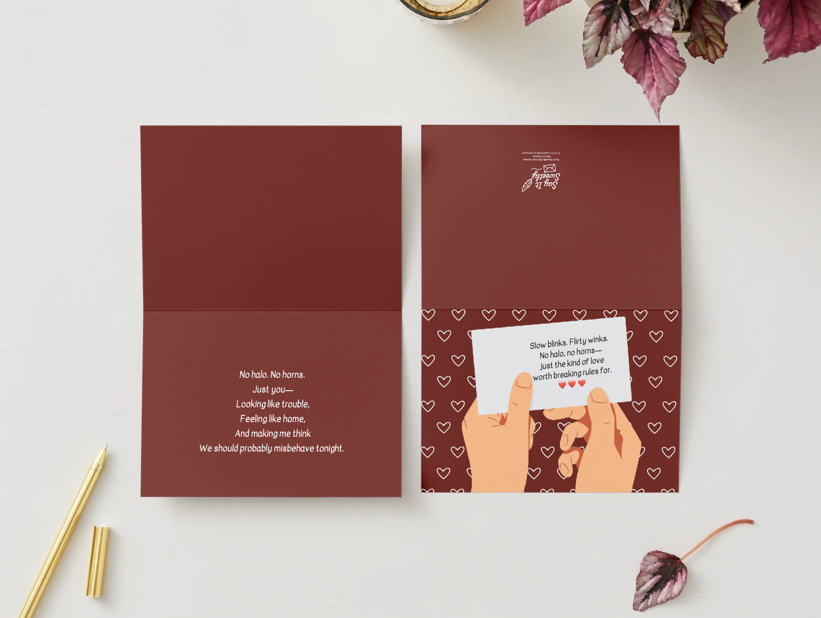 Description: A flirty, modern love card with a deep berry backdrop and hand-drawn hearts. The cover shows hands holding a little note—playful, cheeky, and perfect for Valentine’s Day, anniversaries, or any night you plan to break a few rules together.