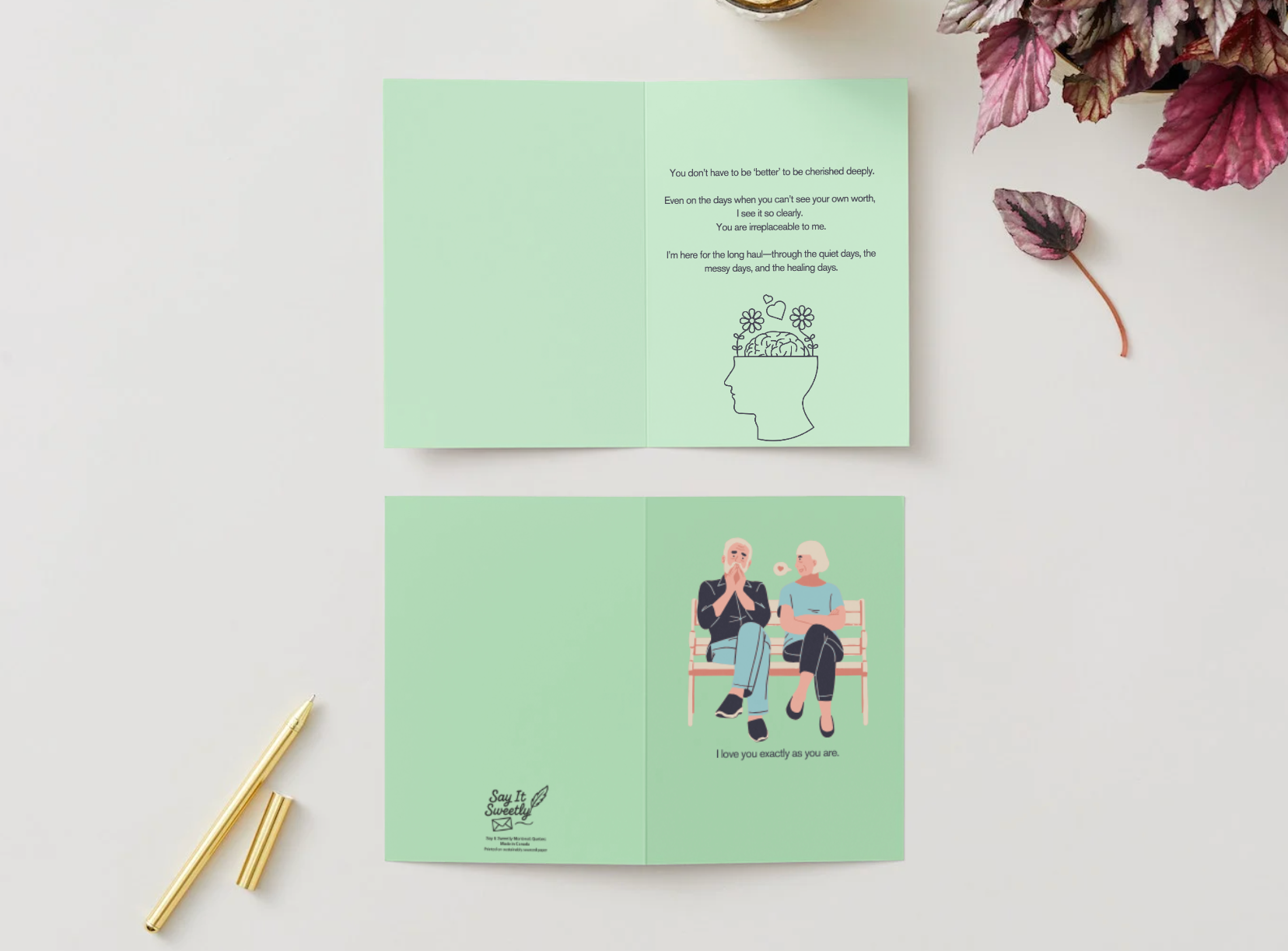 Description: A gentle reminder they’re loved without condition. This minimalist mint-green card features a sweet bench scene and a simple affirmation on the front—perfect for partners or friends who need a little extra tenderness today.