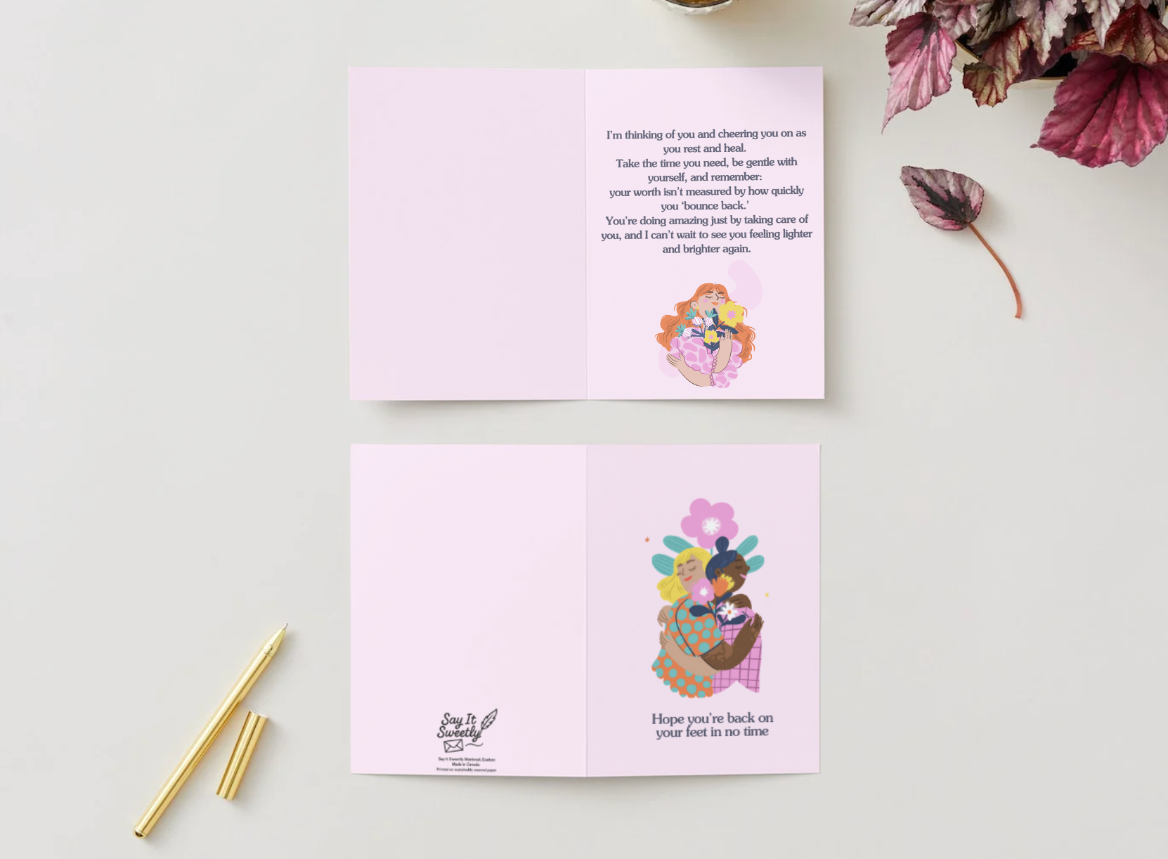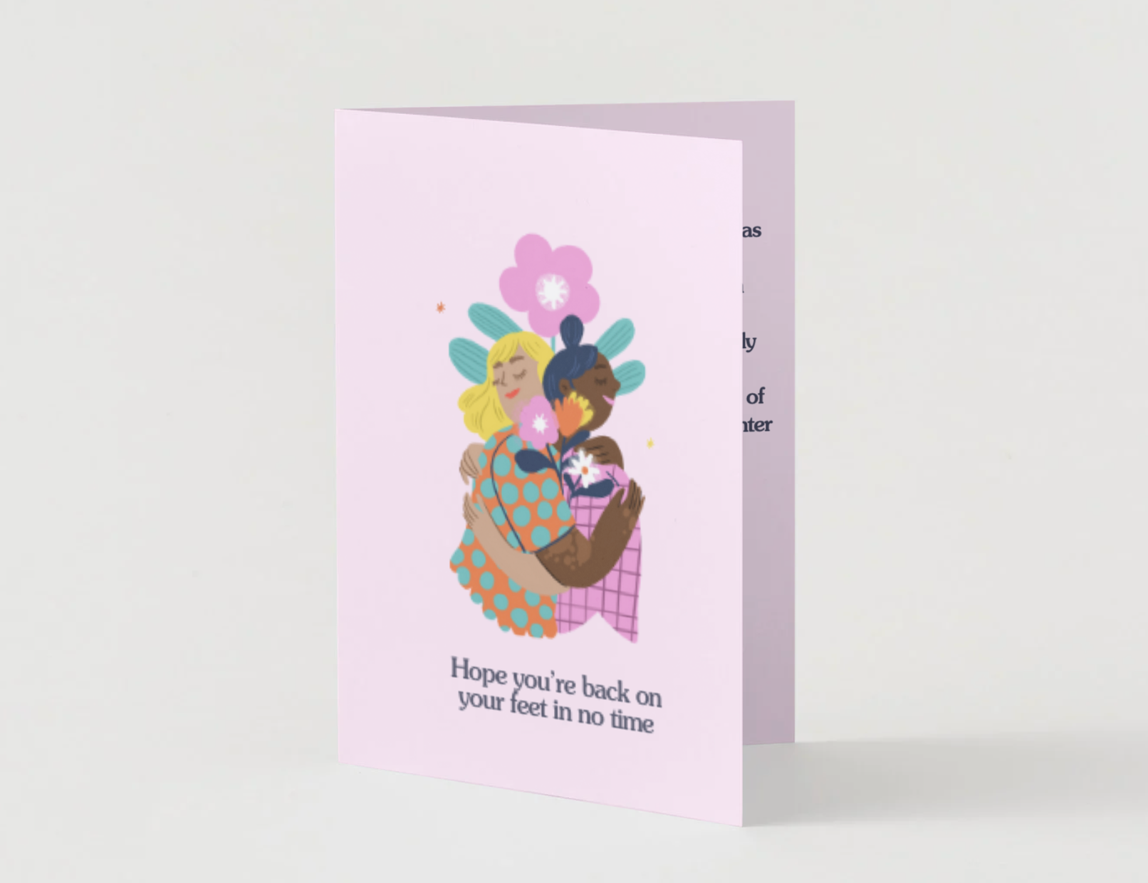 Style: Portrait fold; front features the hugging illustration with the line “Hope you’re back on your feet in no time.” Left inside panel blank for your note; right panel includes the printed message with a small supportive illustration.