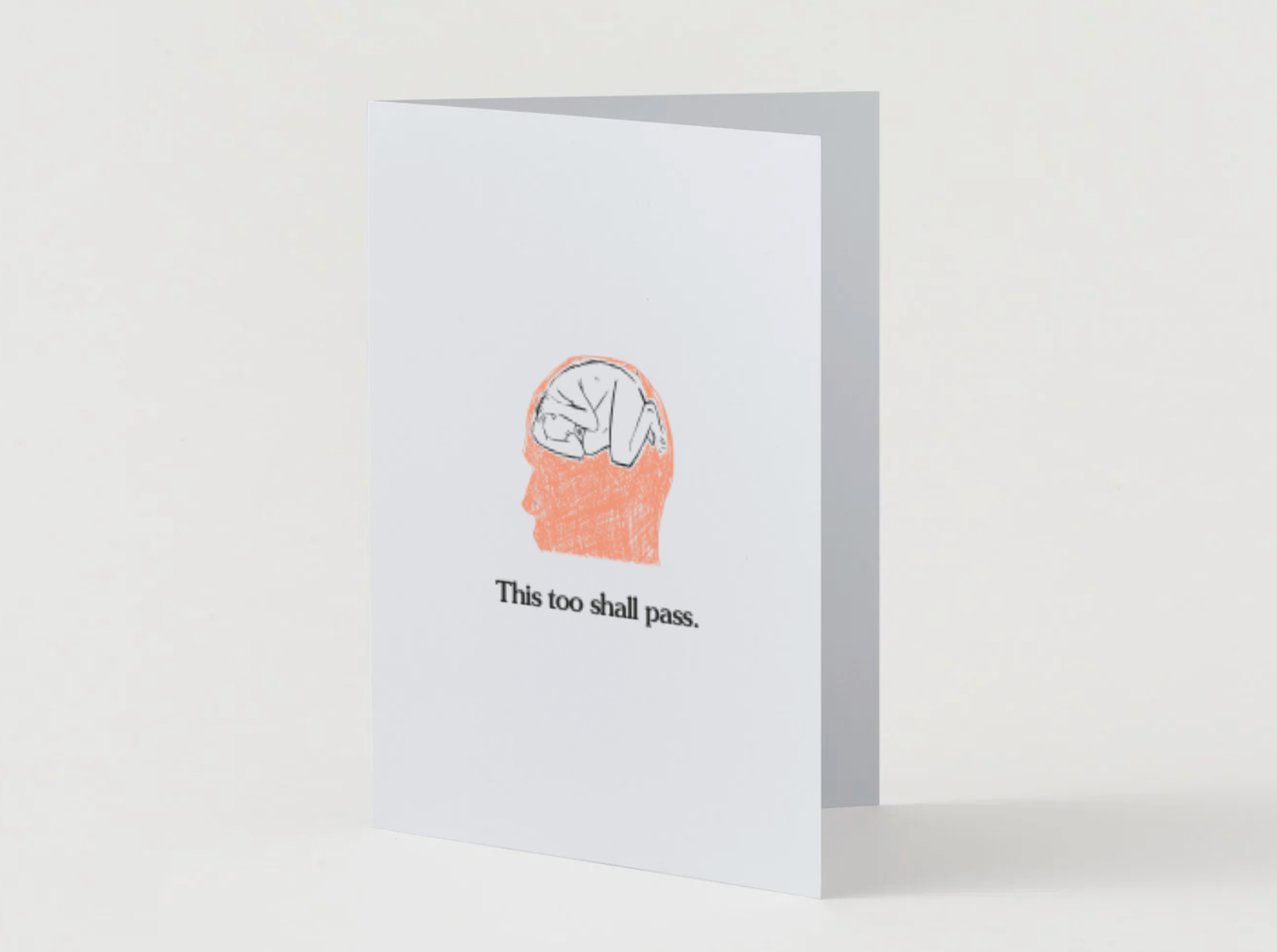 Style: Portrait fold; front shows the head silhouette with the curled figure and the line “This too shall pass.” Left inside panel is blank for your note; right panel includes the printed message.