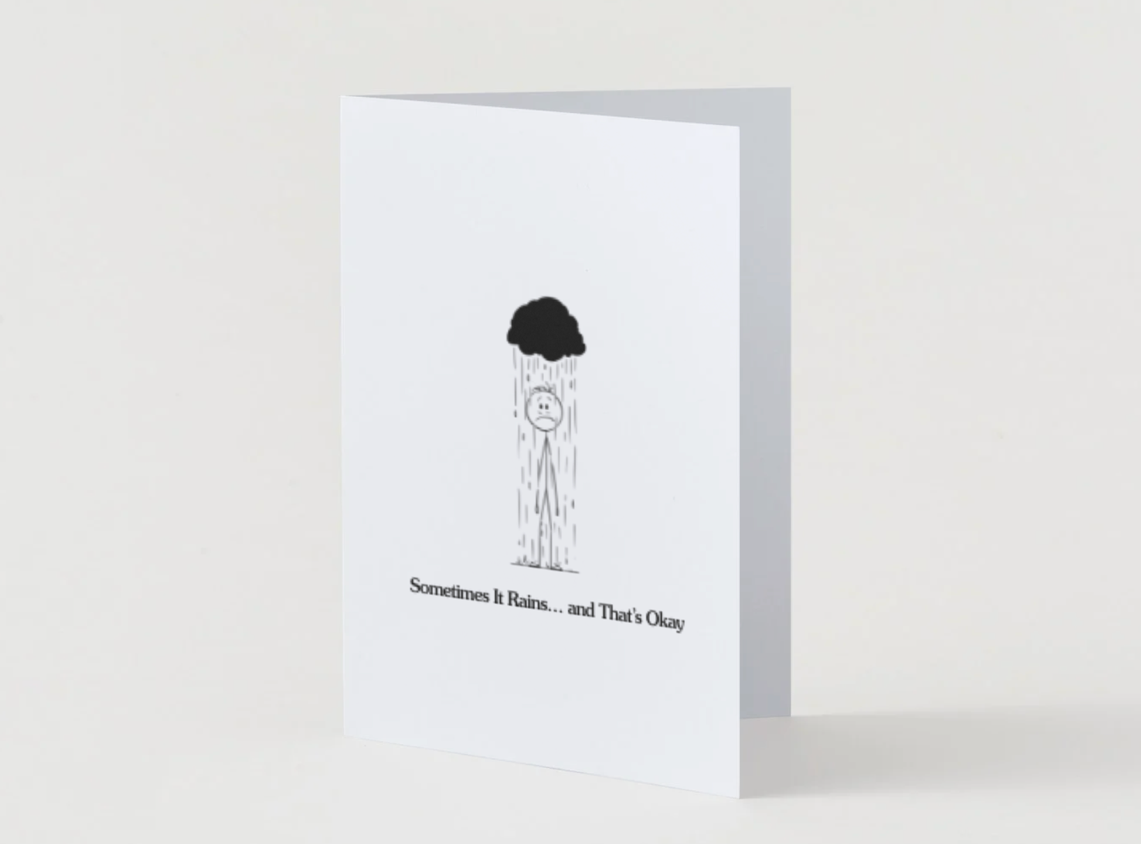 Style: Portrait fold; front reads “Sometimes It Rains… and That’s Okay” with simple line illustration; left inside panel blank for your note, right panel includes the printed message with a small reaching-out-across-the-bench sketch.