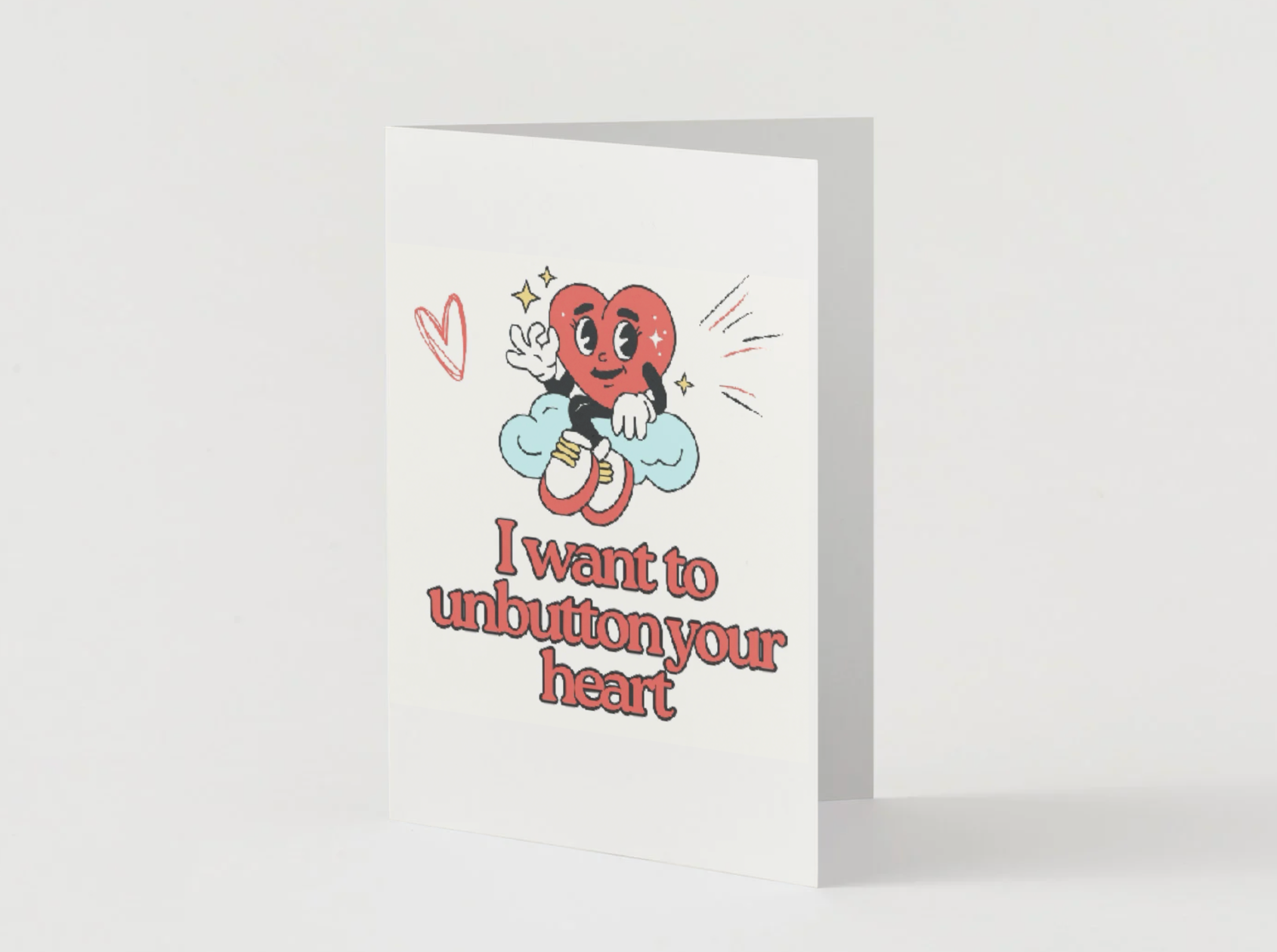 Description: This playful and retro-style card features a whimsical, cartoonish heart character with a friendly face, arms, and legs, waving from atop a fluffy cloud. This card is a fun and unique way to express affection and a desire for a deeper connection, making it perfect for Valentine's Day.