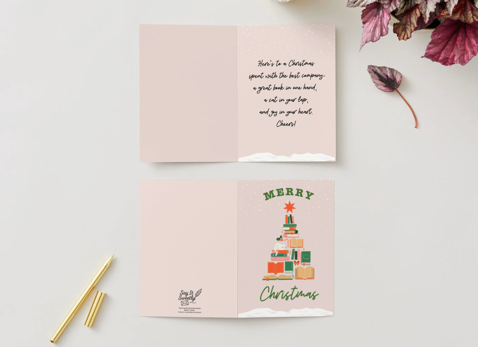 Style: Portrait fold; cover shows the book-stack tree with “Merry Christmas.” Left inside panel blank for your note; right inside panel prints the message below.