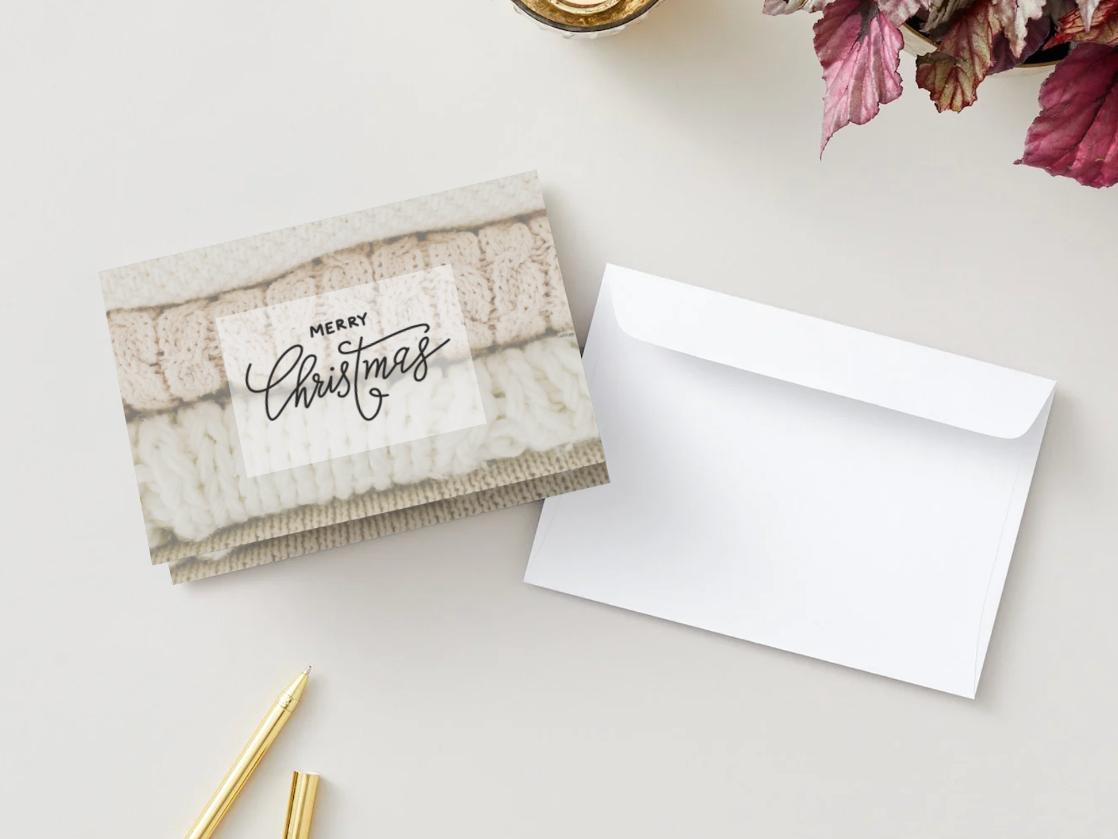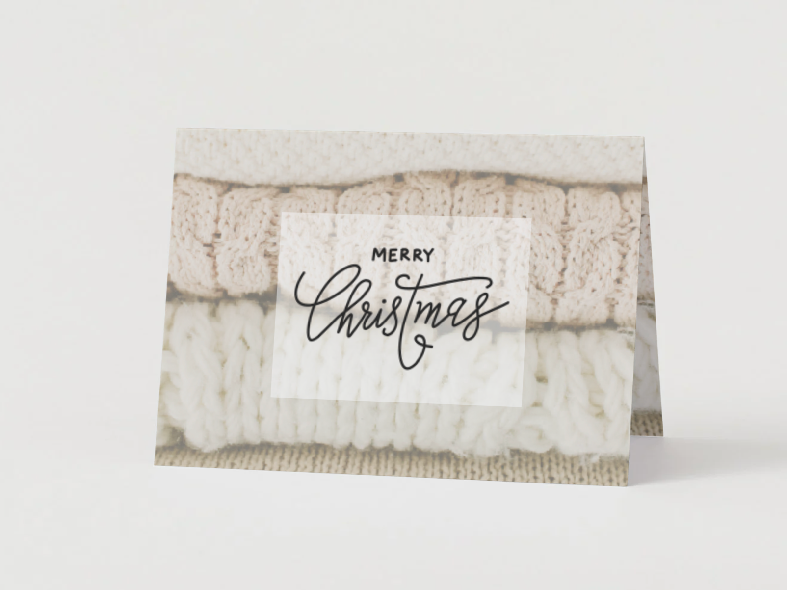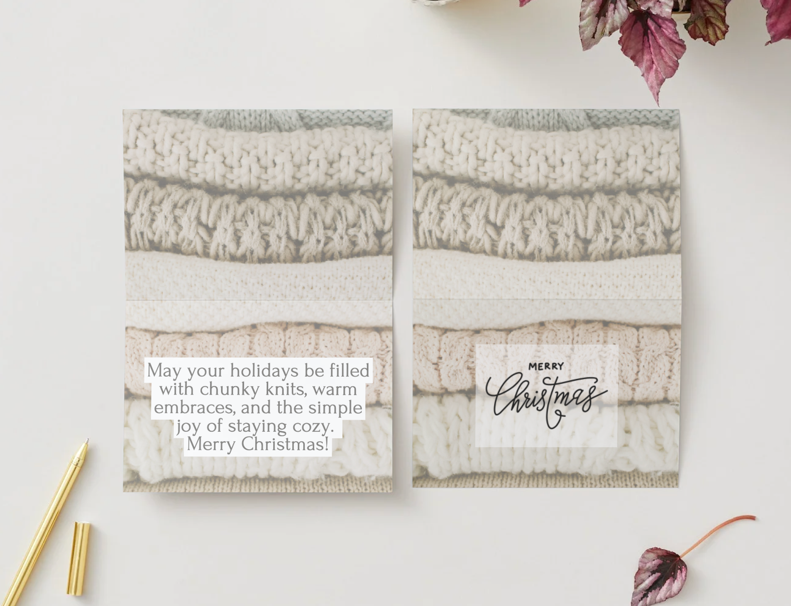 Style: Landscape fold; cover features stacked knits with “Merry Christmas” script. Inside includes the printed sentiment below, with space for your personal note.