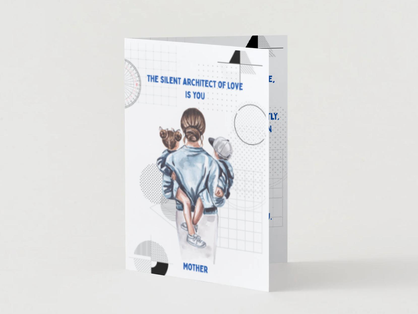 Description: Honor the woman who builds everything from the heart with this modern, minimalist card featuring a mother carrying two little ones, geometric accents, and navy lettering that reads, “THE SILENT ARCHITECT OF LOVE IS YOU.”