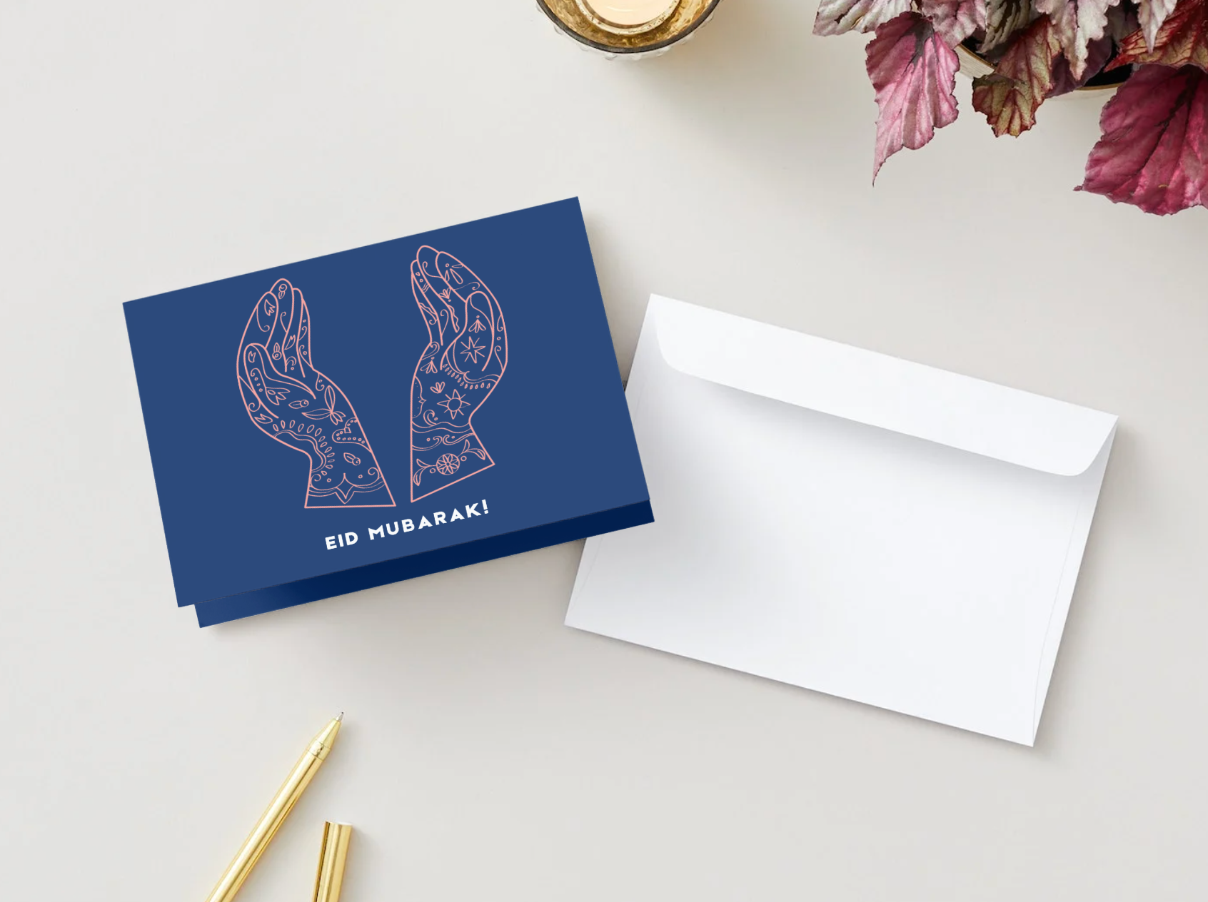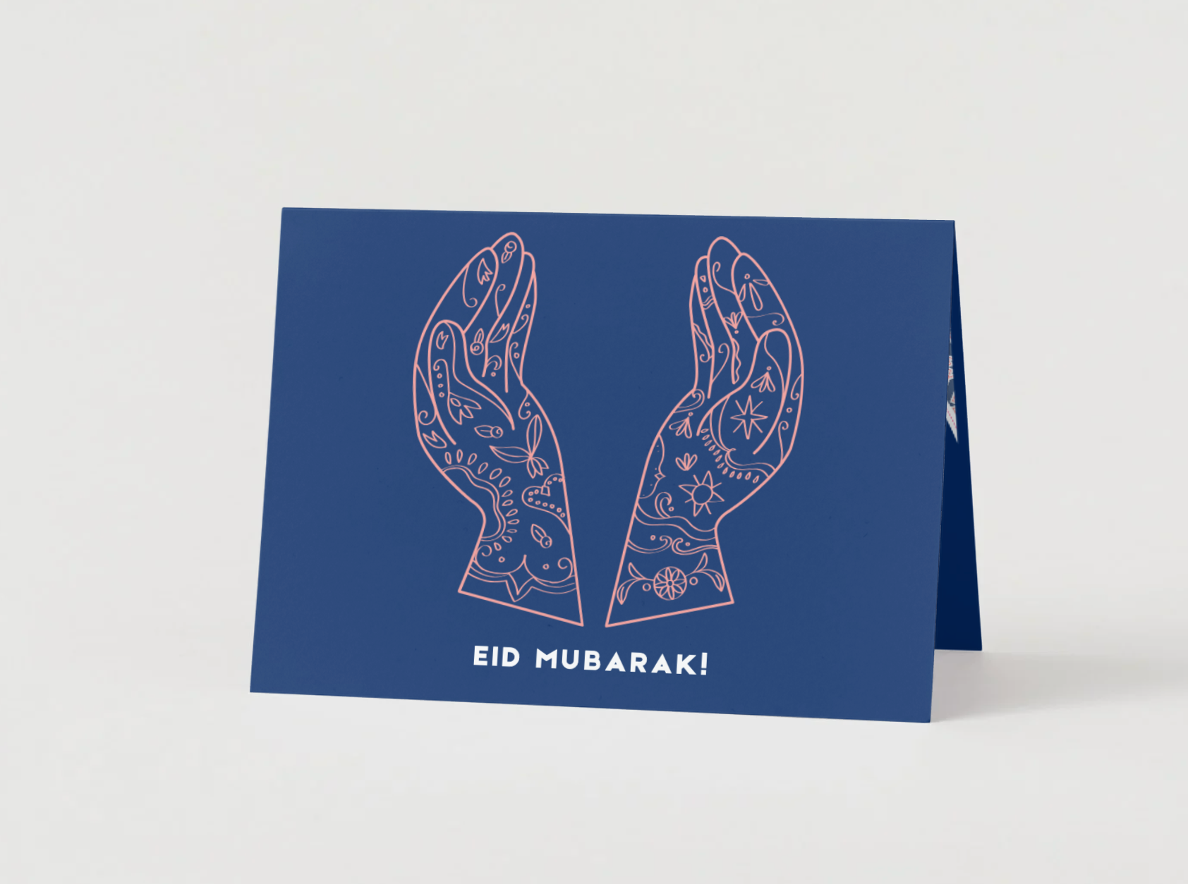 Description: A modern Eid card featuring elegant henna-style hands in prayer on a deep navy background—minimal, meaningful, and perfect for Eid al-Fitr or Eid al-Adha.