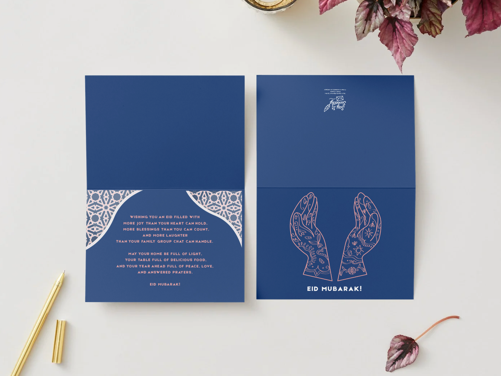 Message inside: "Wishing you an Eid filled with more joy than your heart can hold, more blessings than you can count, and more laughter than your family group chat can handle. May your home be full of light, your table full of delicious food, and your year ahead full of peace, love, and answered prayers. Eid Mubarak!"
